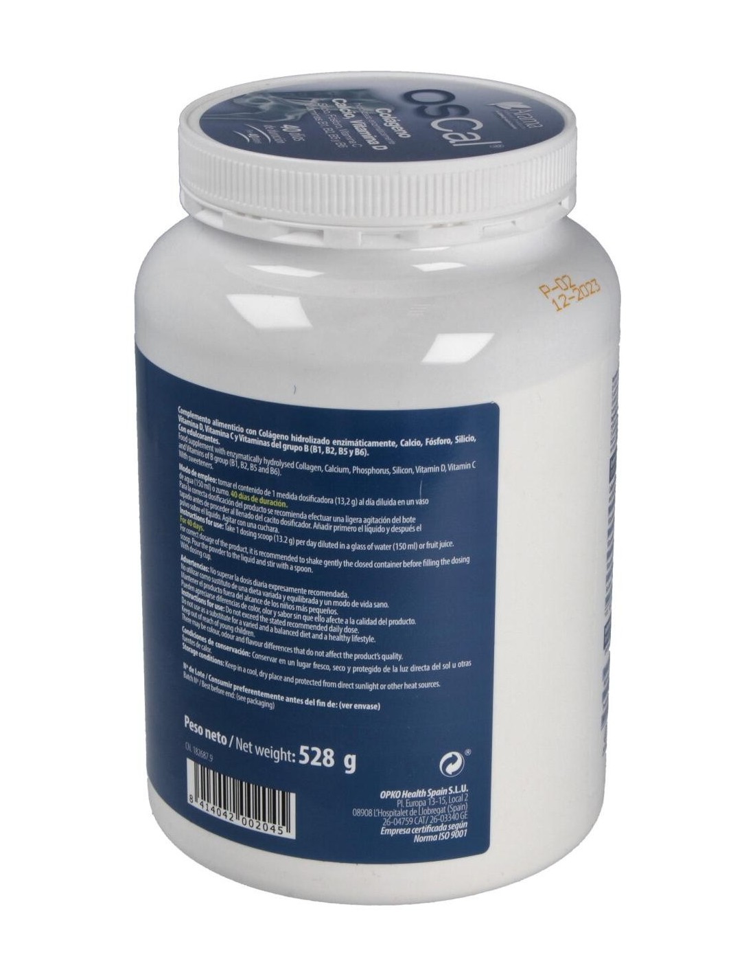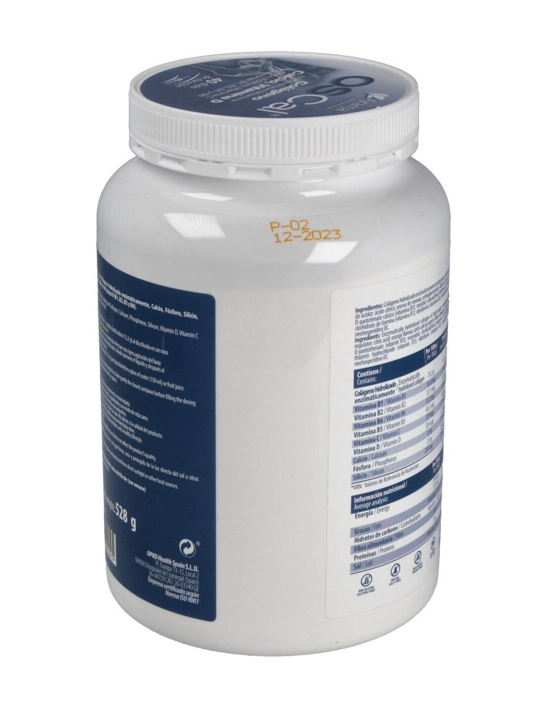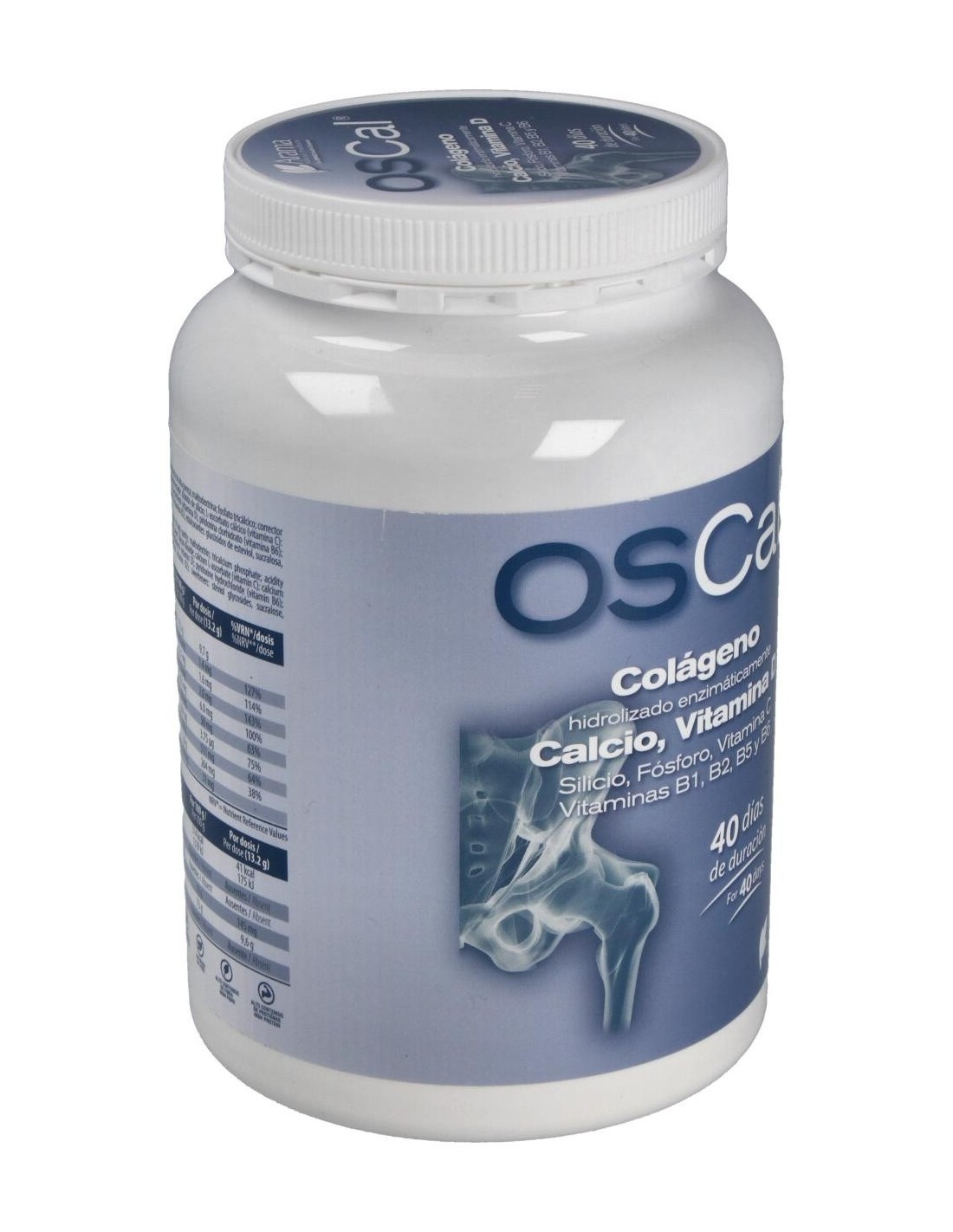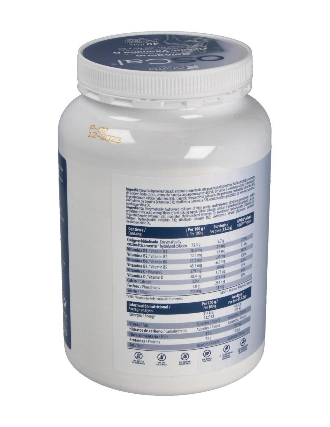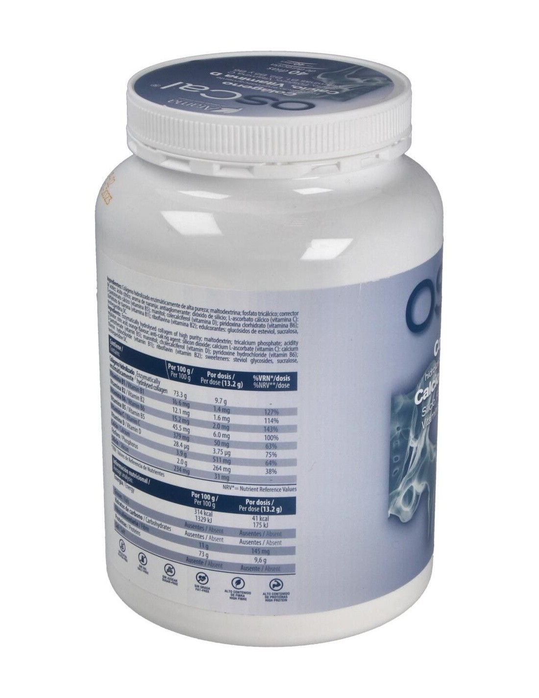 Colágeno hidrolizado enzimáticamente de alta pureza: maltodextrina: fosfato tricálcico: corrector de acidez: ácido cítrico: aroma de naranja: antiaglomerante: dióxido de silicio: L-ascorbato cálcico (vitamina C): D-pantotenato cálcico (vitamina B5): colecalciferol (vitamina D): piridoxina clorhidrato (vitamina B6): clorhidrato de tiamina (vitamina B1): riboavina (vitamina B2): edulcorantes: glucósidos de esteviol, sucralosa, neohesperidina DC.