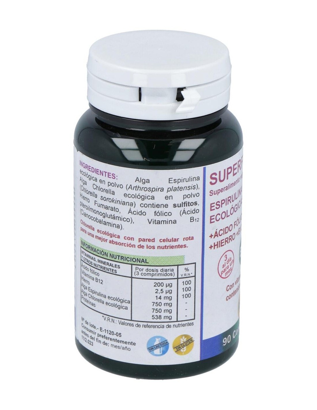 Complemento alimenticio vegetal ecológico espirulina con acido folico, hierro y vitamina b12 que ayuda a combatir la anemia, desmineralización y agotamiento. Ayuda a recuperar la forma física, la energía y la vitalidad y a desintoxicar el organismo. La espirulina es una fuente segura de proteínas. Formato de 90 cápsulas.
