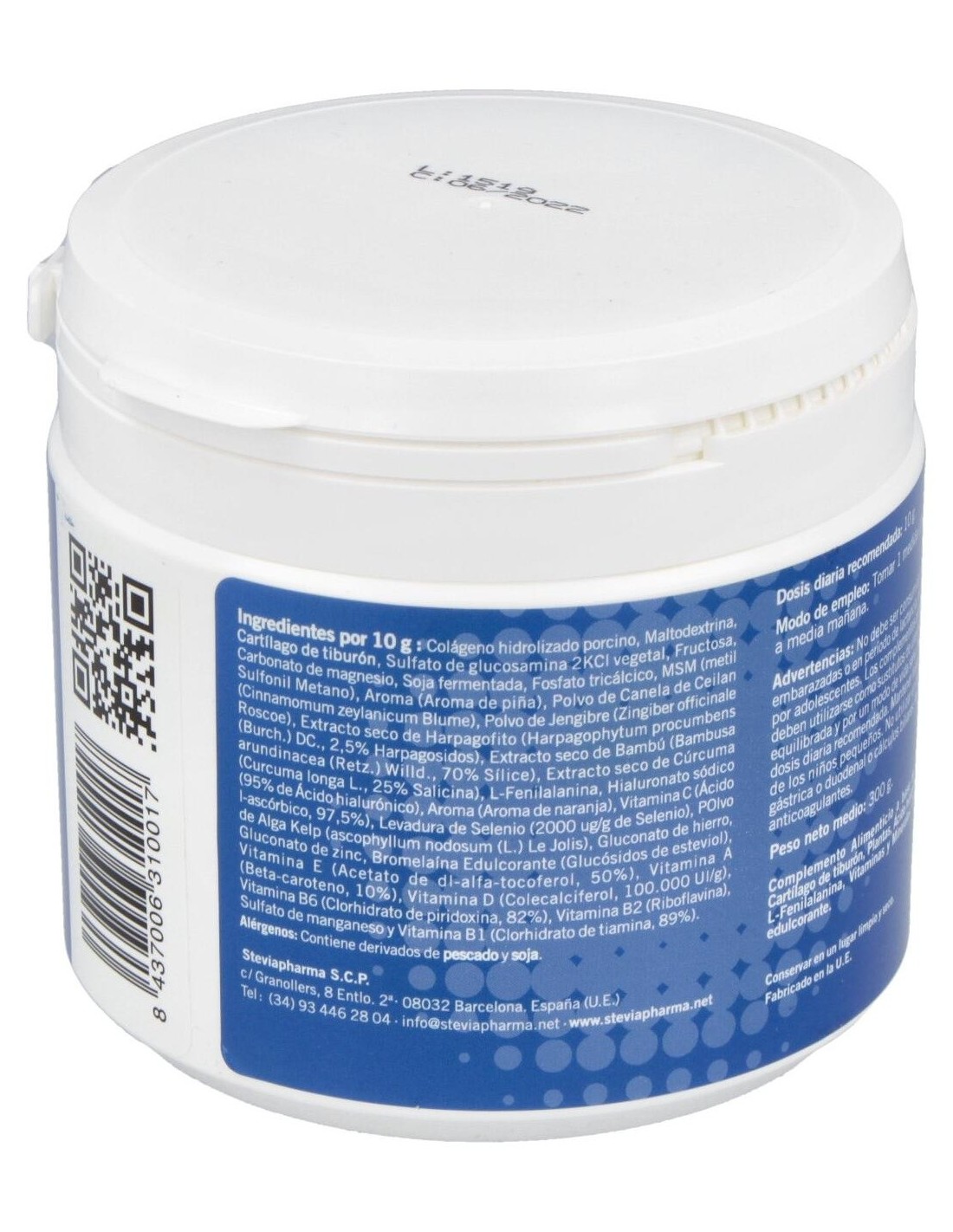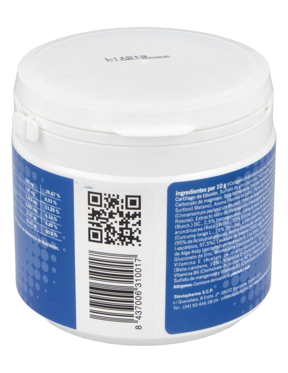 Suplemento en polvo con nutrientes que ayudan al normal mantenimiento de las articulaciones como la glucosamina y el silicio.