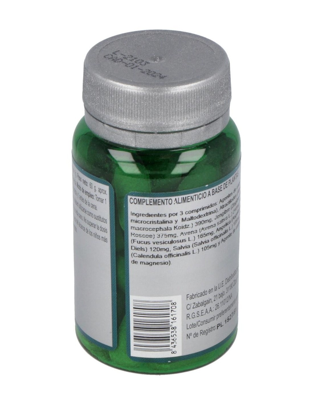 Atractilodes (Atractylodes macrocephala Koidz.), Jengibre (Zingiber officinale Roscoe), Avena (Avena sativa L.), Fucus (Fucus vesiculosus L.), Angélica (Angelica sinensis Diels), Salvia (Salvia officinalis L.), Caléndula (Calendula officinalis L.) y Agentes de carga (Celulosa microcristalina, Maltodextrina y Estearato de magnesio).