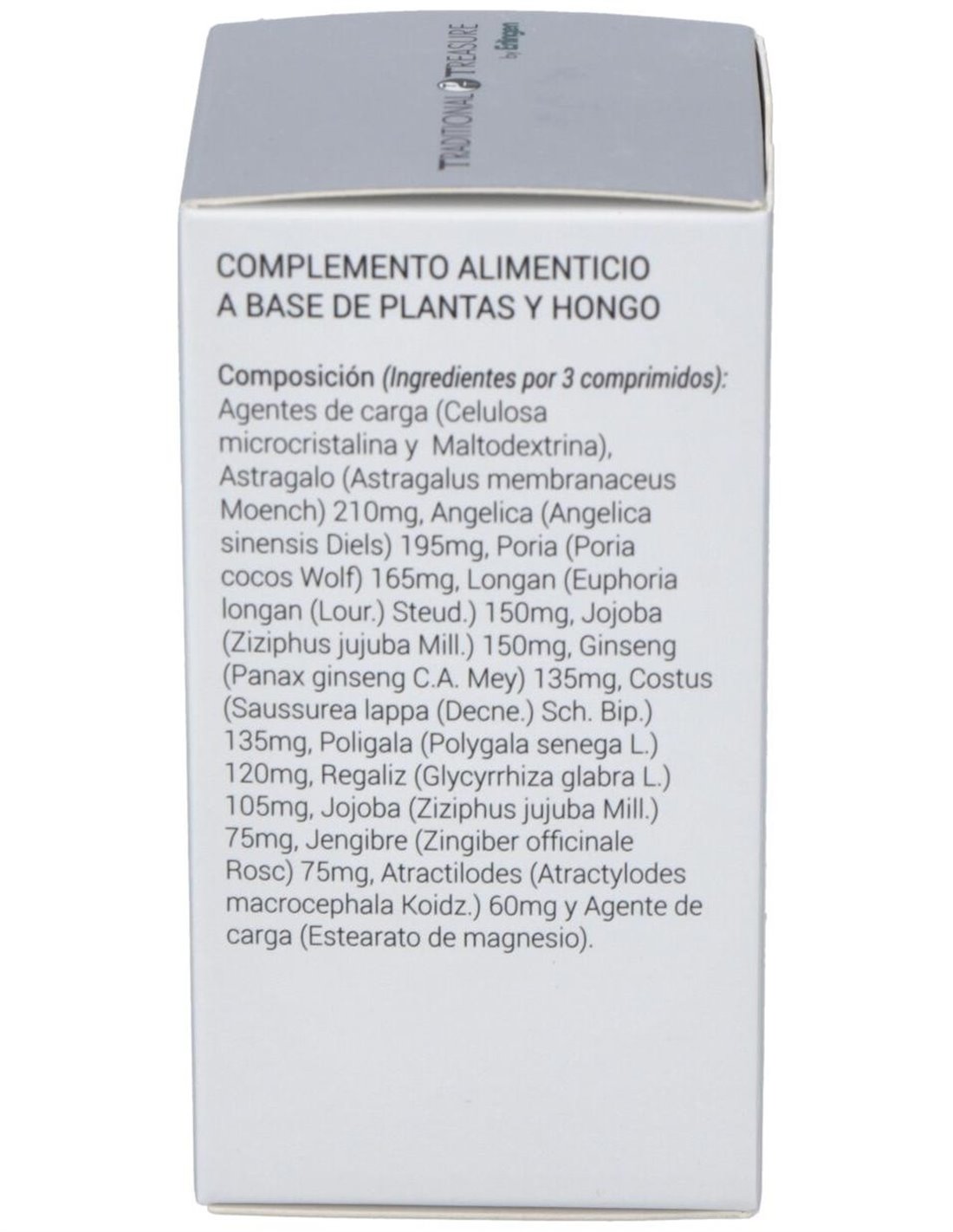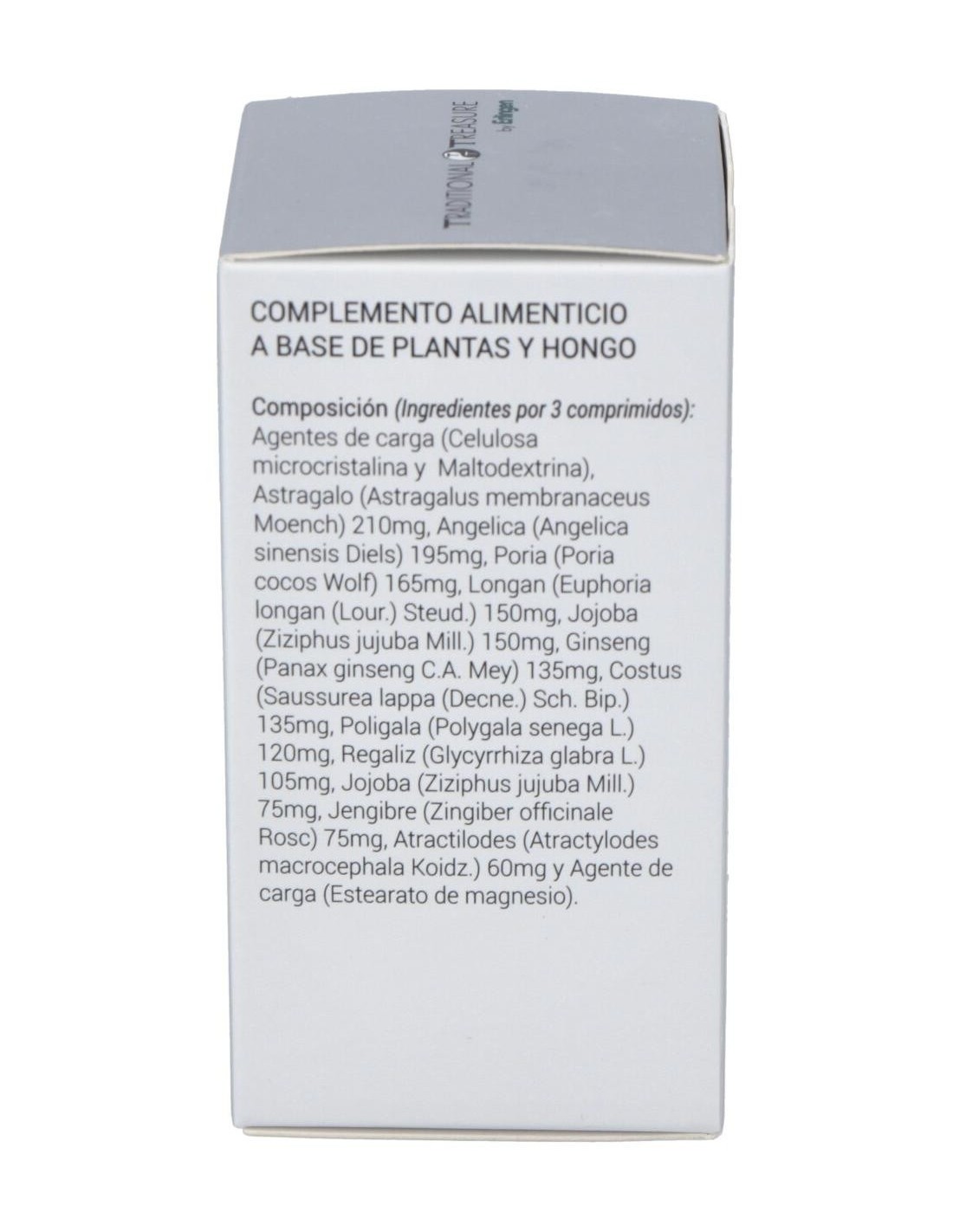 Ingredientes Por 3 Comprimidos: Agentes de Carga (Celulosa Microcristalina Y Maltodextrina), Astragalo (Astragalus Membranaceus Moench) 210mg, Angélica (Angelica Sinensis Diels) 195mg, Poria (Poria Cocos Wolf) 165mg, Longan (Euphoria Longan (Lour.) Steud.) 150mg, Jojoba (Ziziphus Jujuba Mill.) 150mg, Ginseng (Panax Ginseng C.A. Mey) 135mg, Costus (Saussurea Lappa (Decne.) Sch. Bip.) 135mg, Poligala (Polygala Senega L.) 120mg, Regaliz (Glycyrrhiza Glabra L.) 105mg, Jojoba (Ziziphus Jujuba Mill.) 75mg, Jengibre (Zingiber Officinale Rosc) 75mg, Atractilodes (Atractylodes Macrocephala Koidz.) 60mg Y Agente de Carga (Estearato de Magnesio).