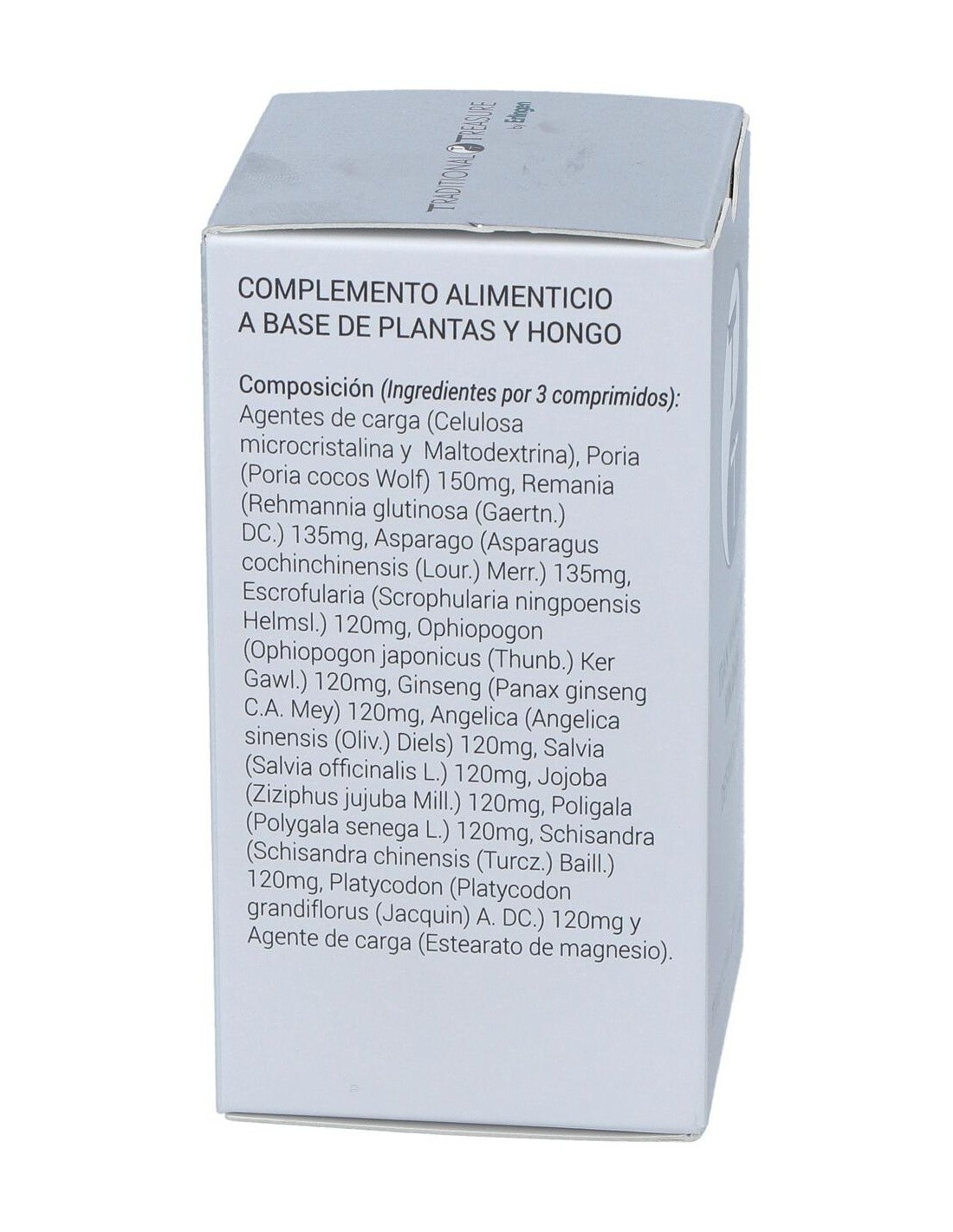 Poria (Poria cocos Wolf), Remania (Rehmannia glutinosa (Gaertn.) DC.), Asparago (Asparagus cochinchinensis (Lour.) Merr.), Escrofularia (Scrophularia ningpoensis Helmsl.), Ophiopogon (Ophiopogon japonicus (Thunb.) Ker Gawl.), Ginseng (Panax ginseng C.A. Mey), Angelica (Angelica sinensis (Oliv.) Diels), Salvia (Salvia officinalis L.), Jojoba (Ziziphus jujuba Mill.), Poligala (Polygala senega L.), Schisandra (Schisandra chinensis (Turcz.) Baill.) 120mg, Platycodon (Platycodon grandiflorus (Jacquin) A. DC.), Agentes de carga (Celulosa microcristalina, Maltodextrina y Estearato de magnesio).