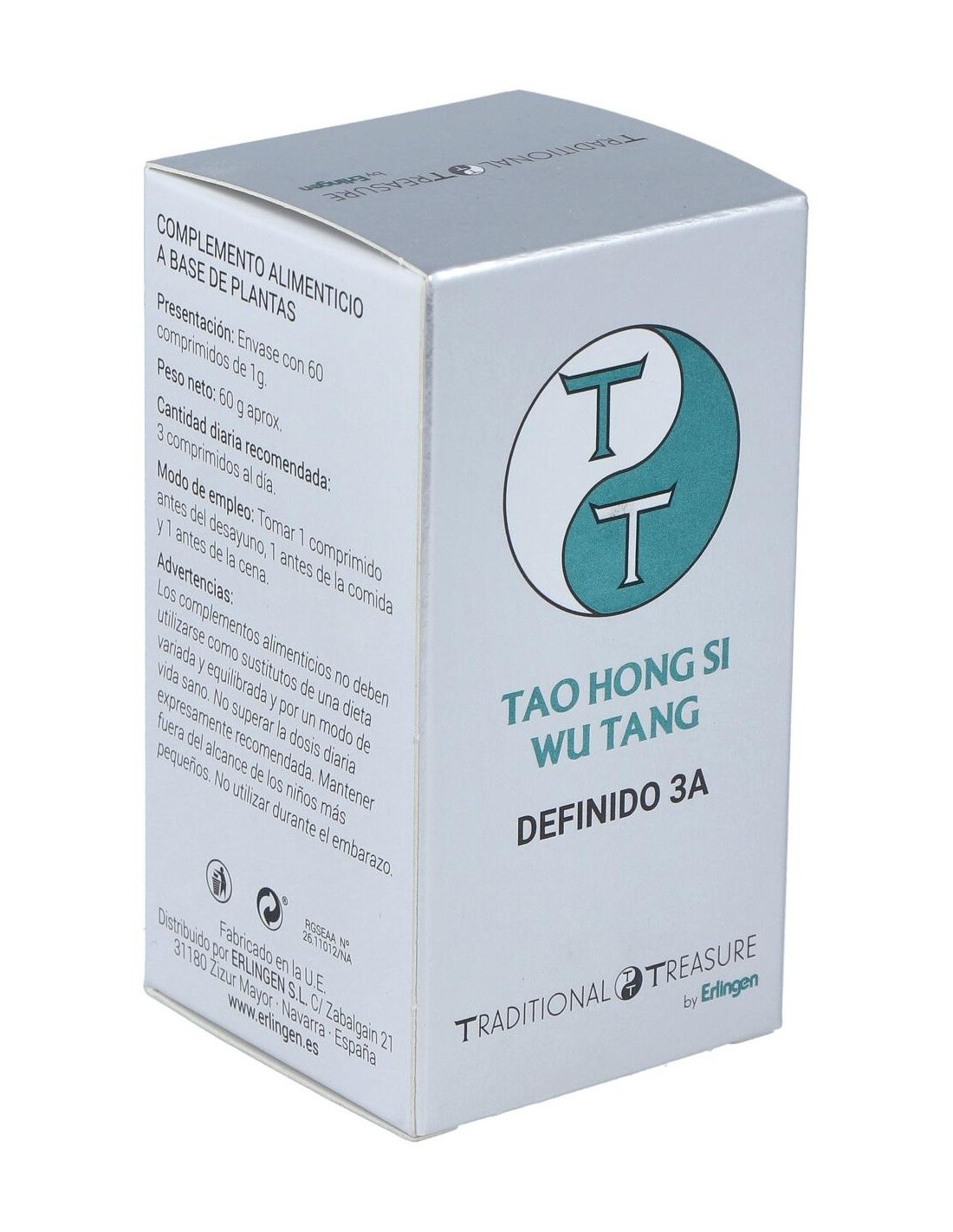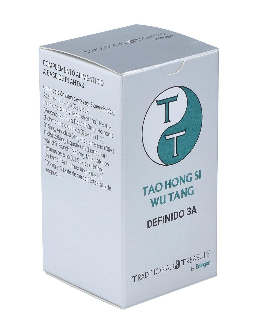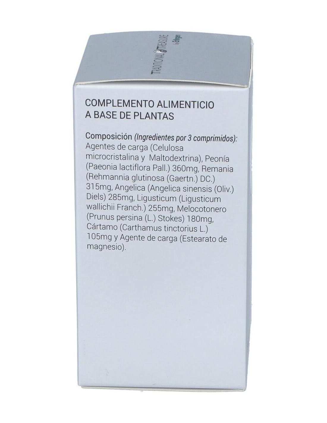 Agentes de carga (Celulosa microcristalina y Maltodextrina), Peonía (Paeonia lactiflora Pall.) 360 mg, Remania (Rehmannia glutinosa (Gaertn.) DC.) 315 mg, Angelica (Angelica sinensis (Oliv.) Diels) 285 mg, Ligusticum (Ligusticum wallichii Franch.) 255 mg, Melocotonero (Prunus persina (L.) Stokes) 180 mg, Cártamo (Carthamus tinctorius L.) 105 mg y Agente de carga (Estearato de magnesio).