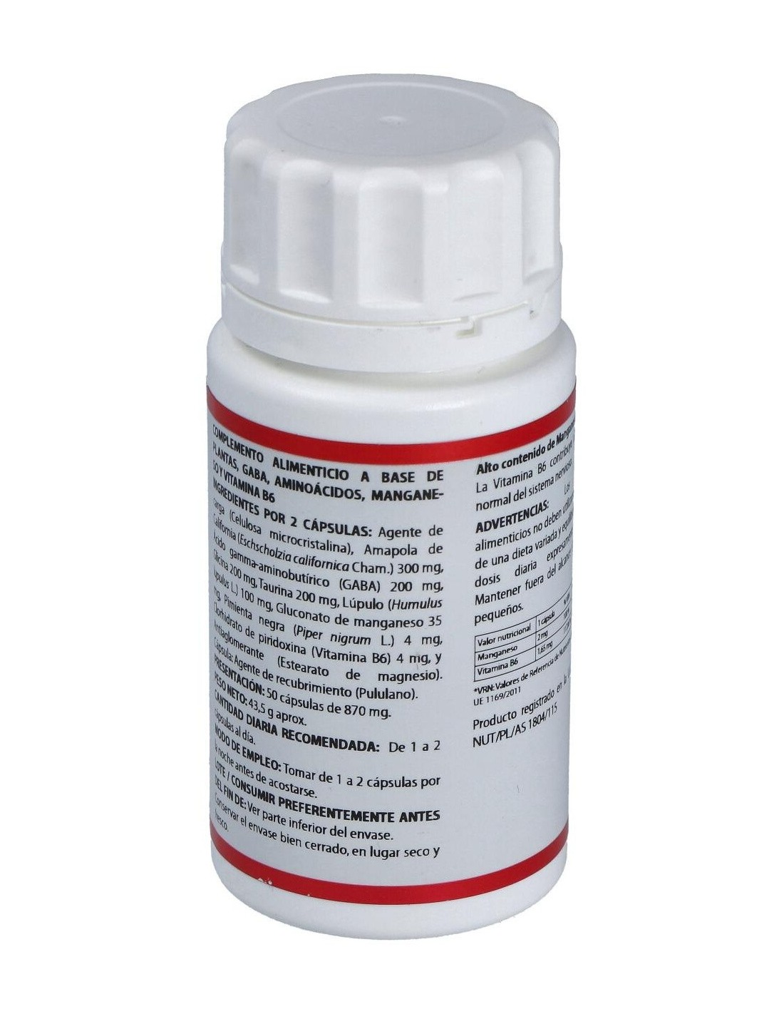 Suplemento a base de plantas, GABA, aminoácidos, manganeso y vitamina B6. El manganeso y la vitamina B6 contribuyen al metabolismo energético normal. La vitamina B6 contribuye al funcionamiento normal del sistema nervioso. Apto para vegetarianos, diabéticos y pacientes con dietas restrictivas.