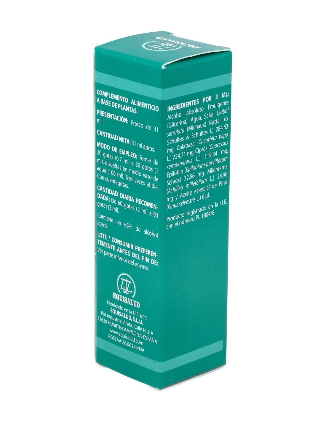 Sabal (Sabal serrulata (Michaux) Nuttall ex Schultes & Schultes f.), calabaza (Cucurbita pepo L.), ciprés (Cupressus sempervirens L.), epilobio (Epilobium parviflorum Scheb.), milenrama (Achillea millefolium L.) y pino (Pinus sylvestris L.) Diluyentes: alcohol absoluto, glicerina y agua purificada.