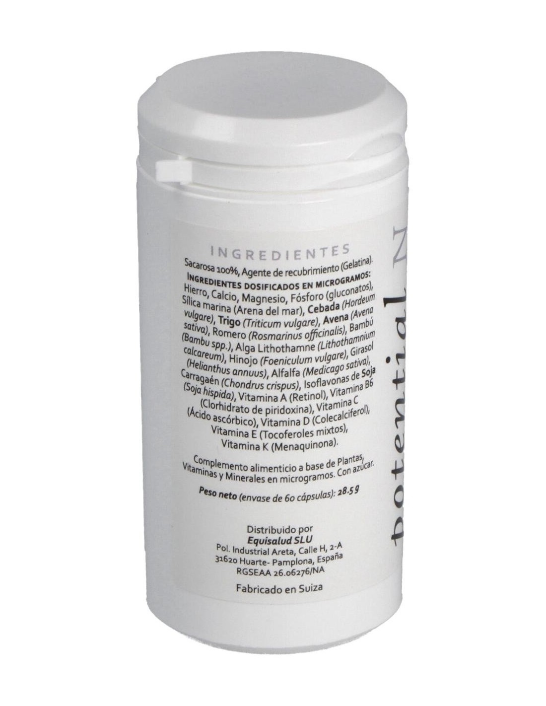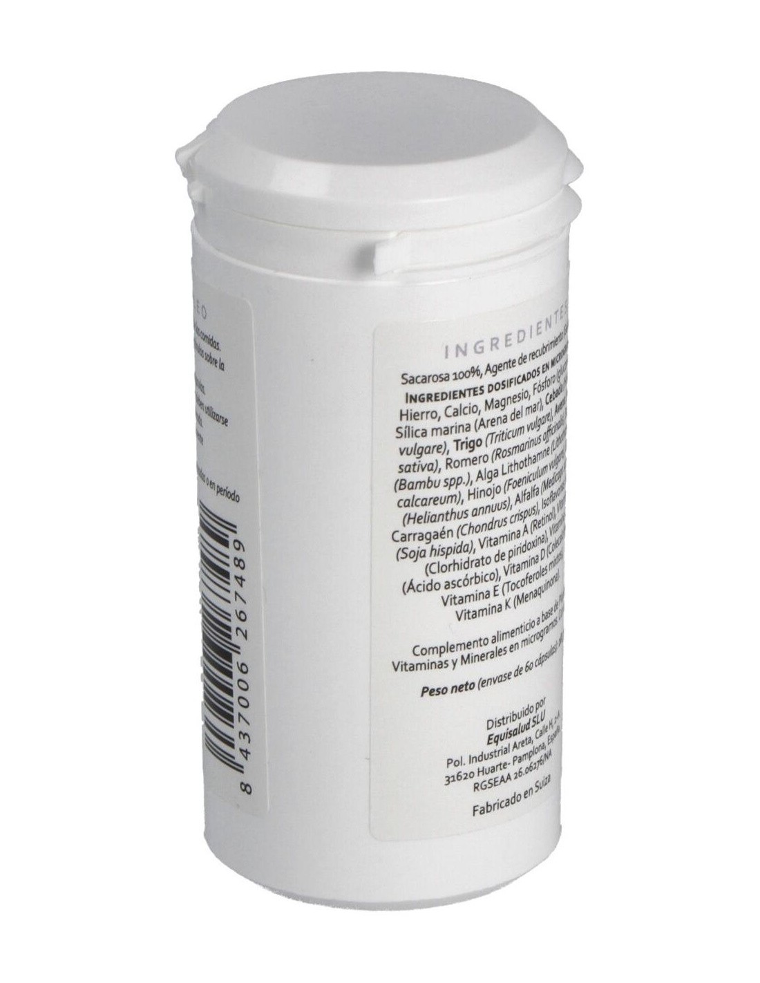 Rosmarinus officinalis (Romero), Triticum vulgare (Trigo), Zincum (Zinc), Cebada, Vitaminas A, C, E, Melissa officinalis (Melisa), Ferrum (Hierro), Foeniculum vulgare (Hinojo), Calcarea (Calcio), Silica marina (Sílice marino), Chondrus crispus (Musgo de Irlanda), Lithotamnium calcareum (Litotamnio), Phosphorus (Fósforo), Magnesium (Magnesio), Helianthus Annuus (Girasol), Vitamina B6, Vitamina D, Bambusa species (Bambú), Hordeum vulgare (Cebada), Avena sativa (Avena), Foeniculum vulgare (Hinojo), Medicago sativa (Alfalfa), Soja Hispida (Isoflavonas de Soja), Musgo de Irlanda, Lithotamnium calcareum (Litotamnio), Magnesio, Vitamina K.