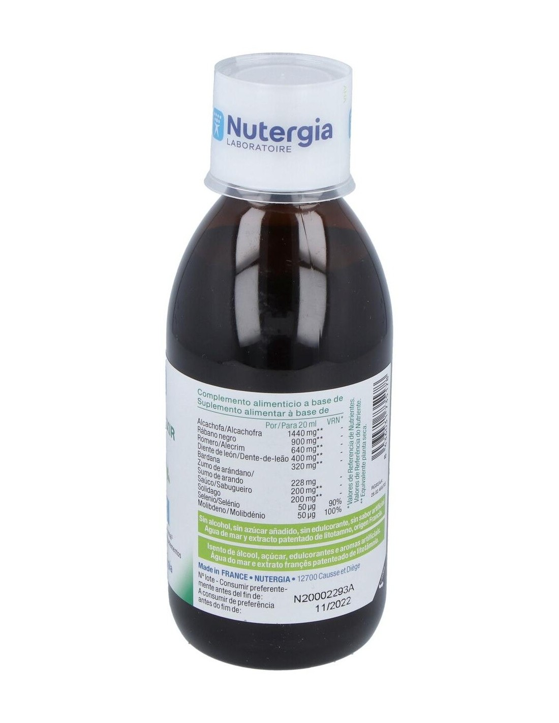 ALCACHOFA, SAÚCO, RÁBANO NEGRO, SOLIDAGO, ROMERO, ZUMO DE ARÁNDANO ROJO, DIENTE DE LEÓN, BARDANA, MOLIBDENO, SELENIO, OLIGOELEMENTOS SELECCIONADOS.