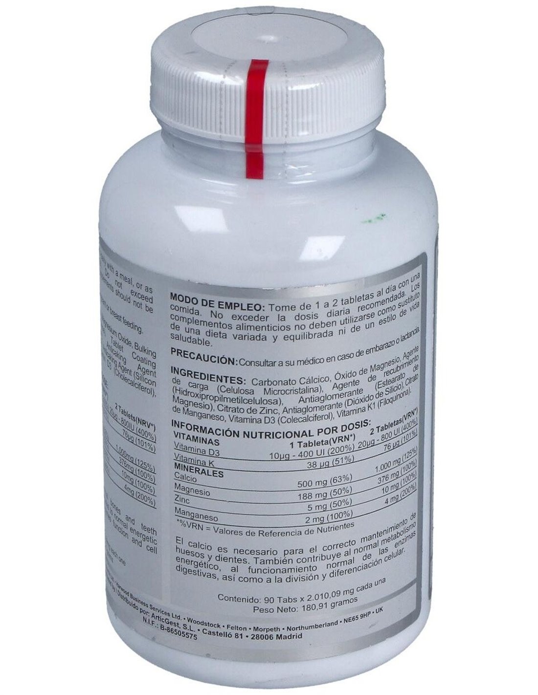 CARBONATO DE CALCIO, ÓXIDO DE MAGNESIO, AGENTE DE CARGA (FOSFATO DICÁLCICO), AGENTE DE RECUBRIMIENTO (CELULOSA MICROCRISTALINA), CITRATO DE ZINC, ANTIAGLOMERANTE (DIÓXIDO DE SILICIO), CITRATO DE MANGANESO, ANTIAGLOMERANTE (ESTEARATO DE MAGNESIO), VITAMINA D3, VITAMINA K1.