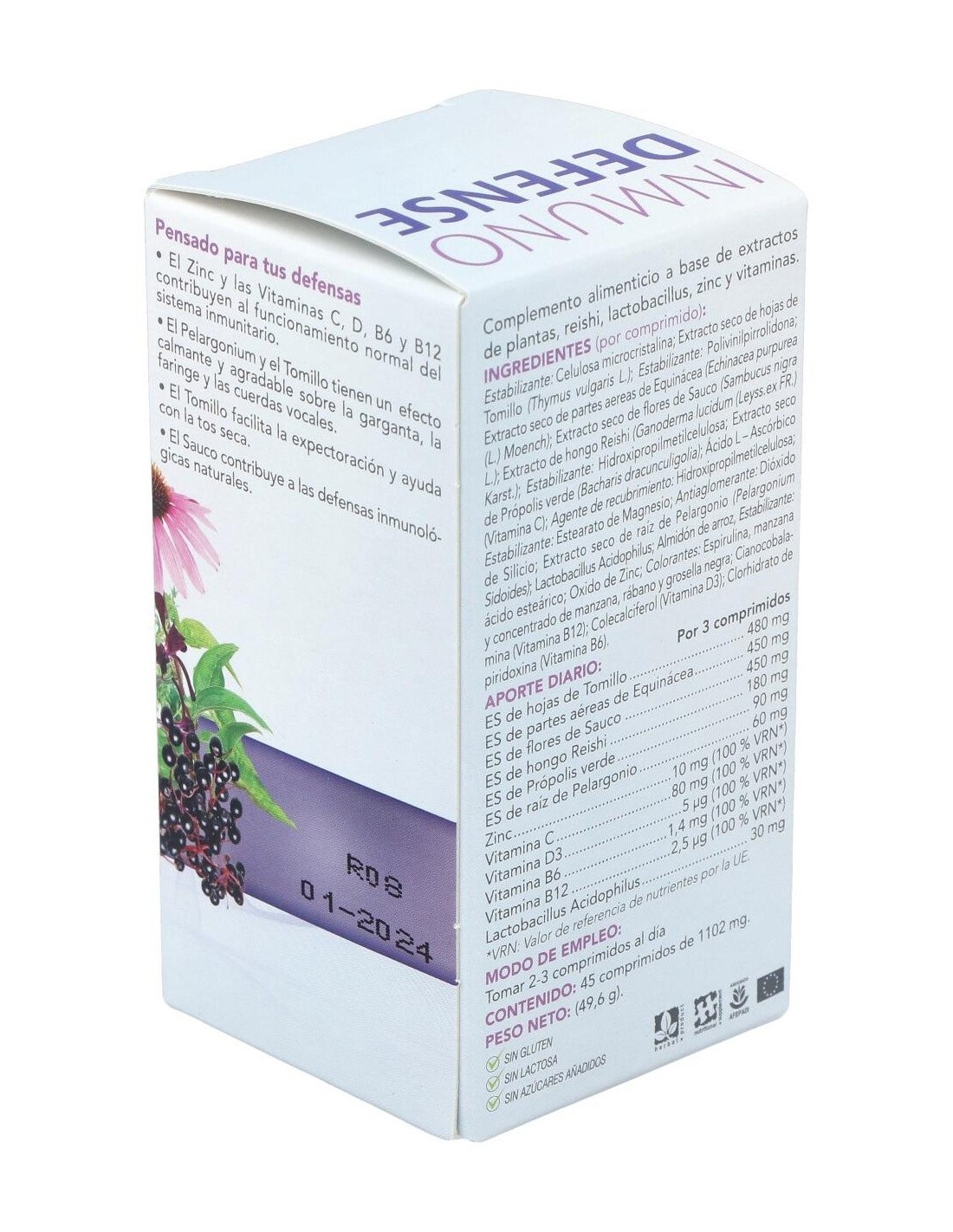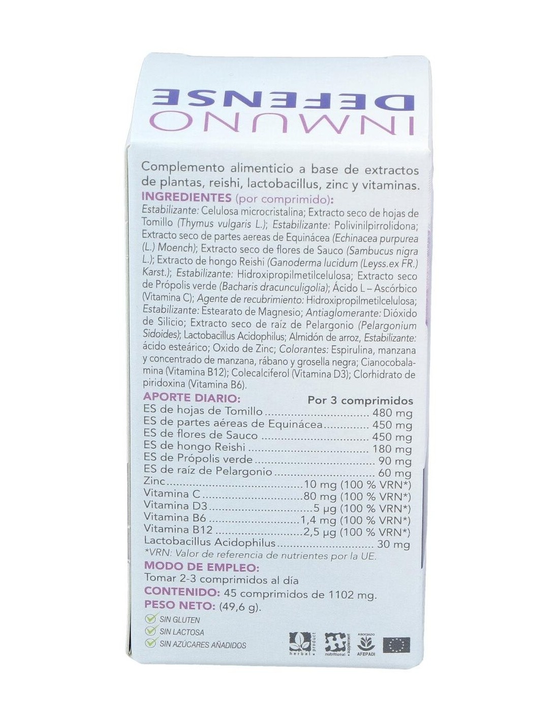 Tomillo, Equinácea, Sauco, Reishi, Própolis verde, Pelargonio, Lactobacillus Acidophilus, Zinc, Vitamina C, Vitamina D3, Vitamina B6 y Vitamina B12.