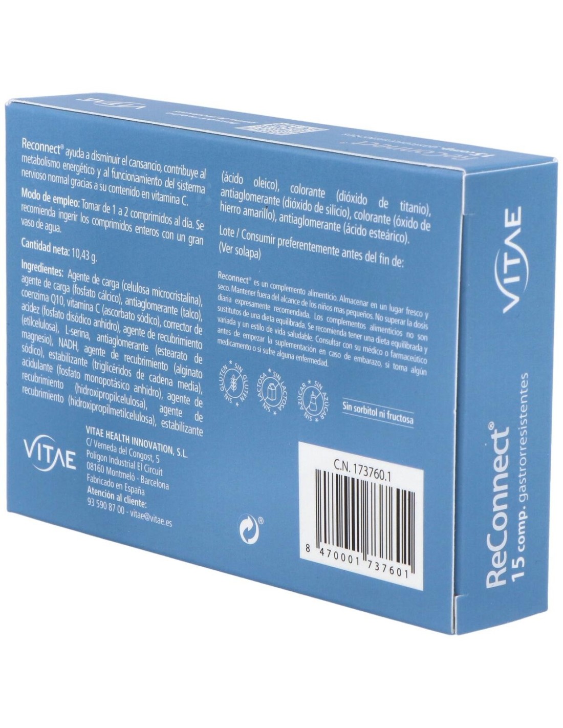 Vitae Reconnect 15 comprimidos es un suplemento que combina NADH (Co-E1), coenzima Q10, serina y vitamina C. Ayuda a mejorar el rendimiento físico y cognitivo.
