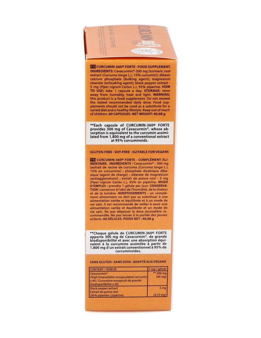 Cavacurmin-300 mg (extracto de raíz de cúrcuma (Curcuma longa L.), 15% en curcumina); fosfato dicálcico dibásico (incrementador de volumen); estearato de magnesio (antiaglomerante); extracto de pimienta negra-5 mg (Piper nigrum Carlos L.), 95% en piperina.