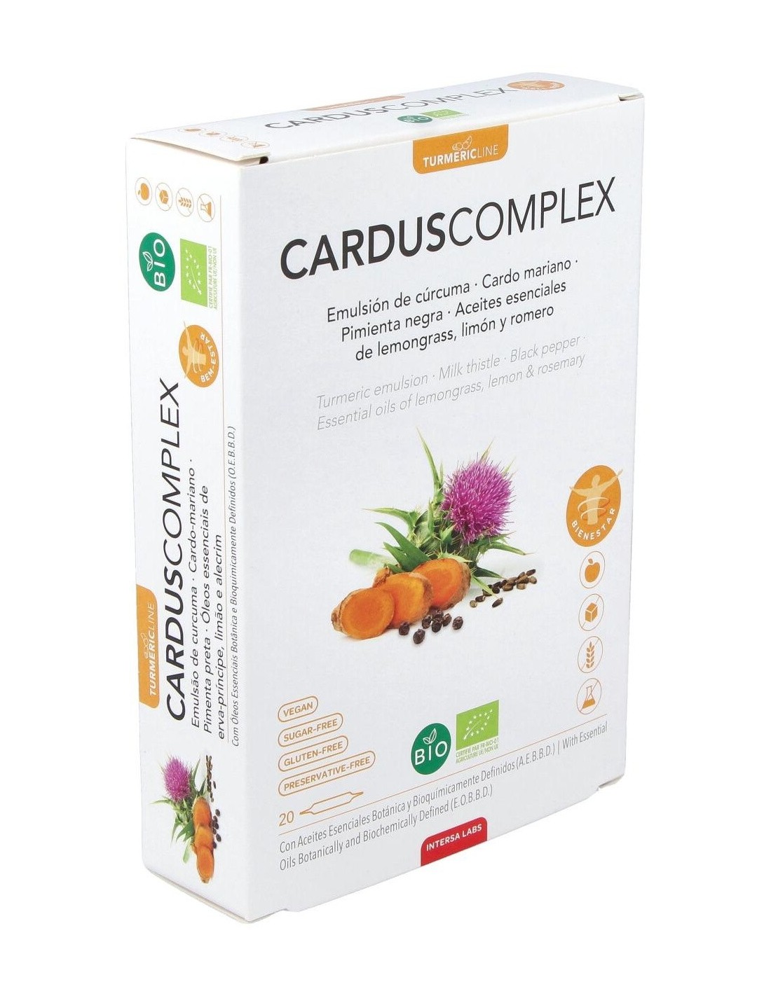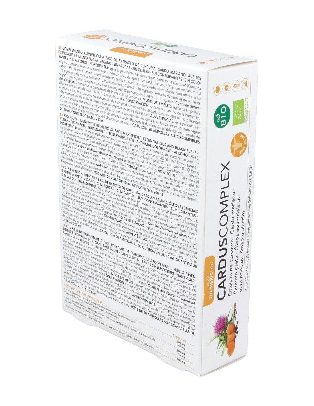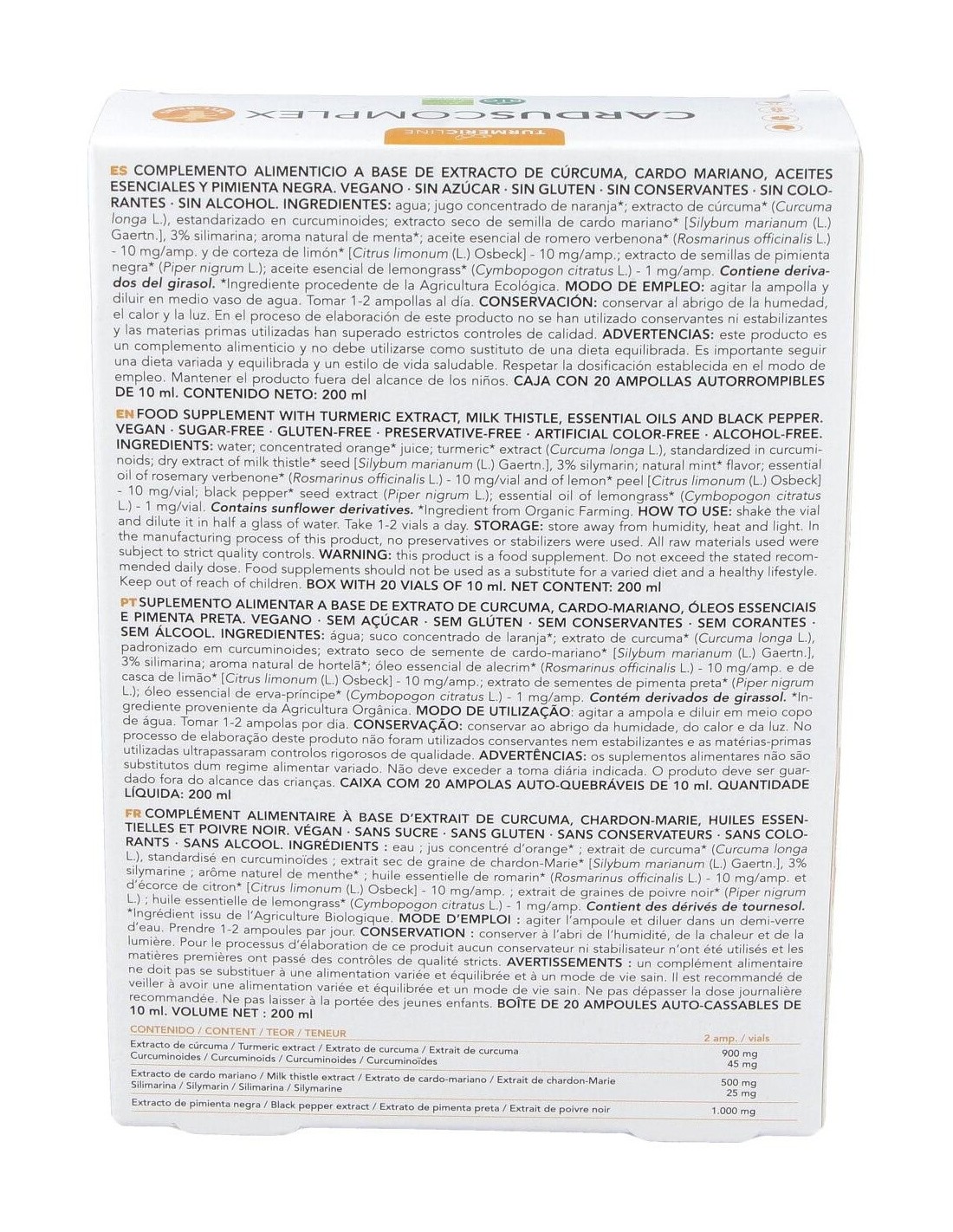 Agua: jugo concentrado de naranja*: Vi-ActiveTM - extracto de cúrcuma BIO [emulsión de rizoma de cúrcuma* (Curcuma longa L.), 14,6% curcuminoides]: extracto seco de semilla de cardo mariano* [Silybum marianum (L.) Gaertn., 3% silimarina], de semillas de pimienta negra* (Piper nigrum L., 10% en piperina): aroma natural de menta*: aceite esencial de romero verbenona*(Rosmarinus officinalis L.) 10 mg/amp., de corteza de limón* [Citrus limonum (L.) Osbeck] 10 mg/amp. y de lemongrass* (Cymbopogon citratus L.) 1 mg/amp.