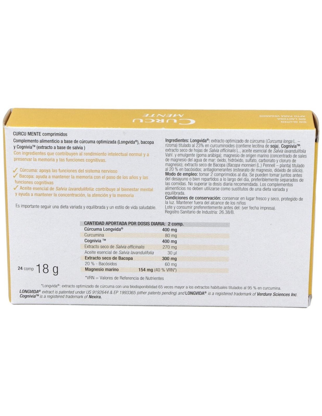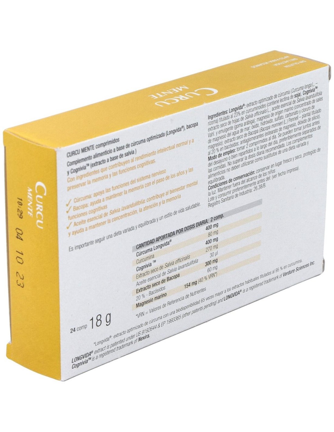 Longvida®: extracto optimizado de cúrcuma (Curcuma longa L. ¿ rizoma) titulado al 23% en curcuminoides (contiene lecitina de soja): CogniviaTM: extracto seco patentado de hojas de Salvia officinalis L., aceite esencial de Salvia lavandulifolia Vahl. y emulgente (goma arábiga): magnesio de origen marino (concentrado de sales de magnesio del agua de mar: óxido, hidróxido, sulfato, carbonato y cloruro de magnesio): extracto seco de Bacopa (Bacopa monnieri (L.) Pennell planta) titulado al 20 % en bacósidos: antiaglomerantes (estearato de magnesio, dióxido de silicio).Longvida®: extracto optimizado de cúrcuma con una biodisponibilidad 65 veces mayor a los extractos habituales titulados al 95% en curcumina.