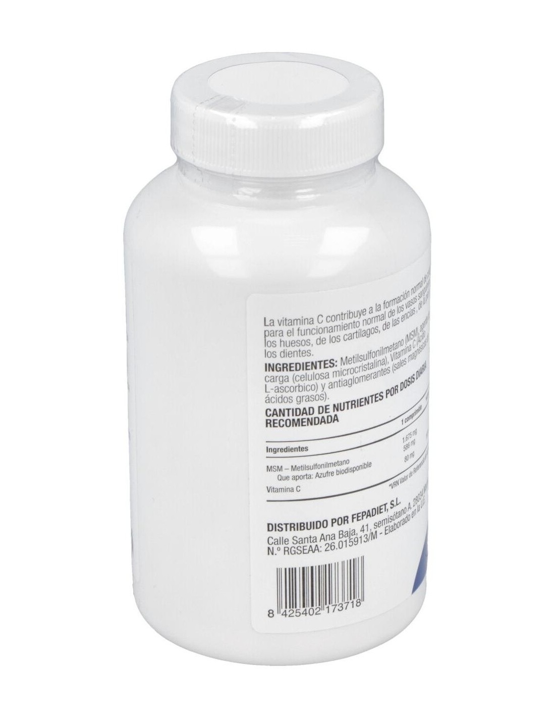 Complemento alimenticio a base de metilsulfonilmetano (MSM) y vitamina C. La vitamina C contribuye a la formación normal de colágeno para el funcionamiento normal de los vasos sanguíneos, de los huesos, de los cartílagos, de las encías , de la piel y de los dientes.