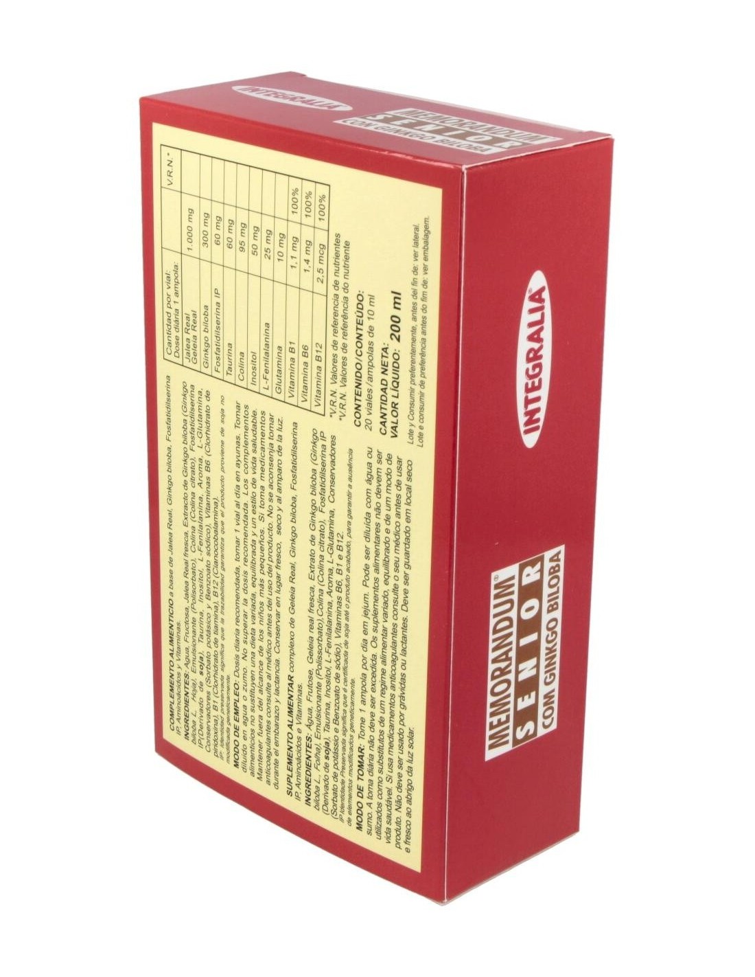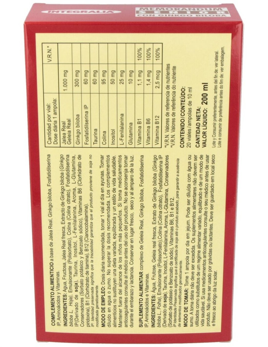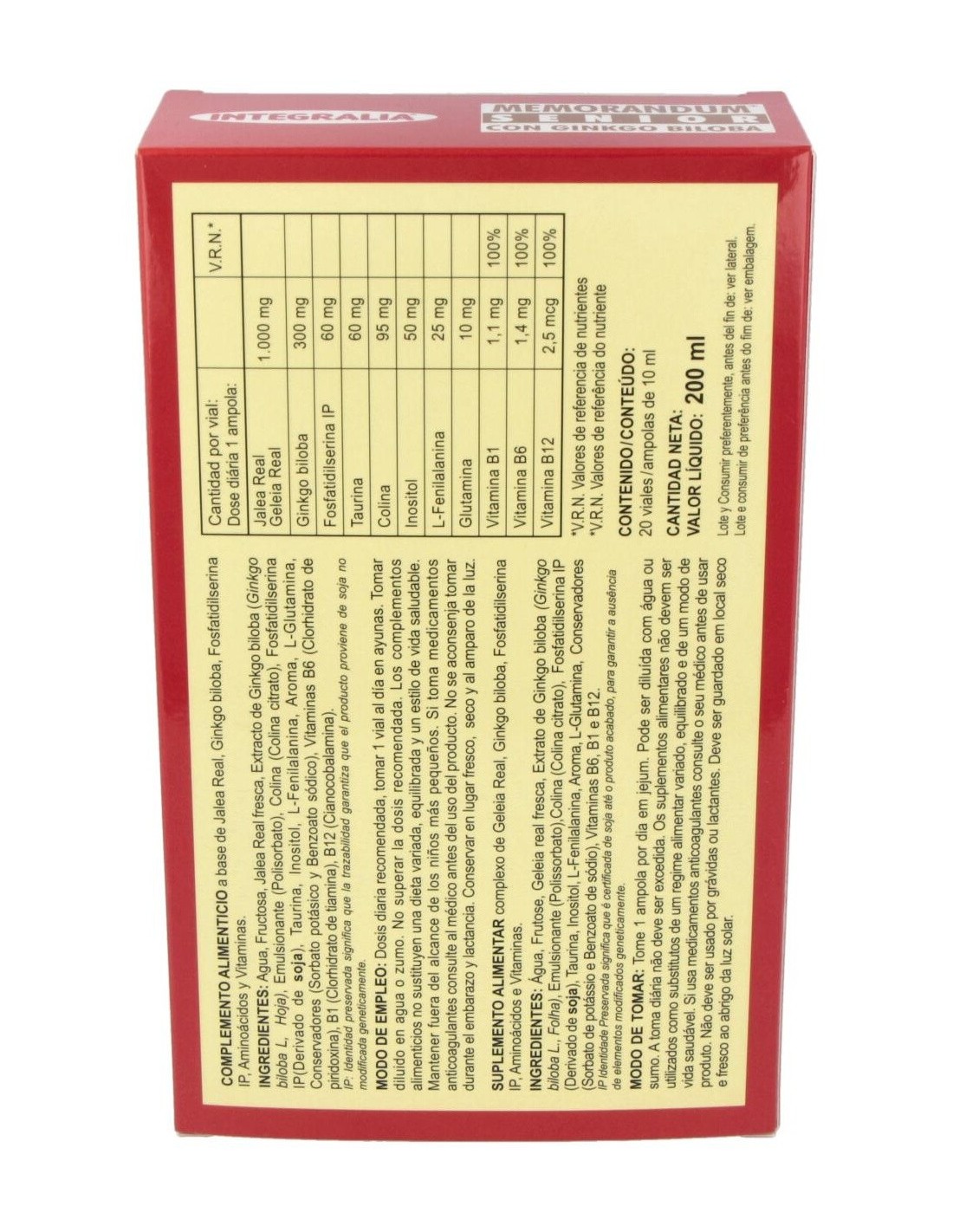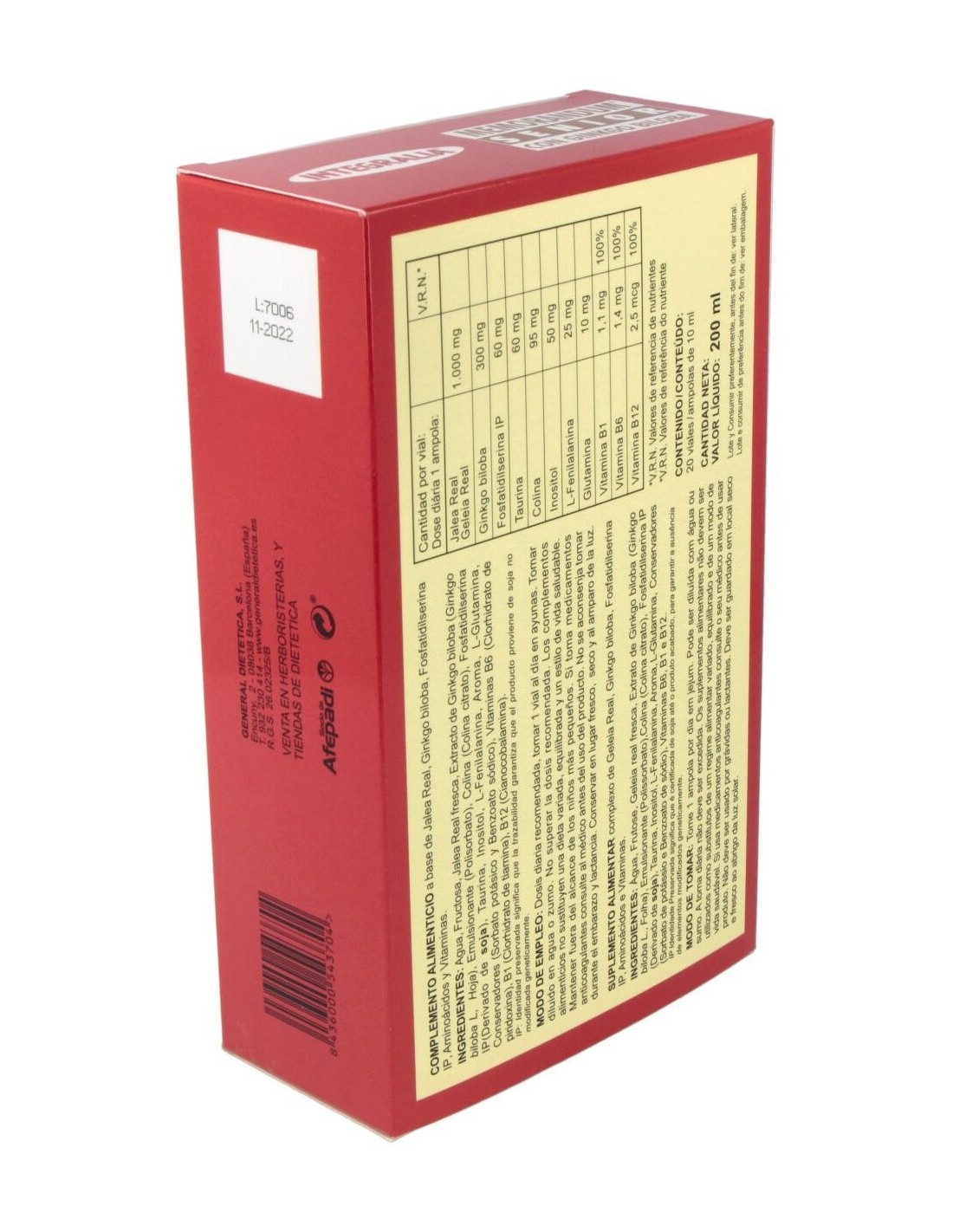 1000 mg de Jalea real fresca, 300 mg de Extracto de Ginkgo biloba, 95 mg de Colina, 60 mg de Fosfatidilserina IP, 60 mg de Taurina, 50 mg de Inositol, 25 mg de L-Fenilalanina, 10 mg L-Glutamina, 1,4 mg de Vitamina B6, 1,1 mg de Vitamina B1, 2,5 mcg de Vitamina B12.