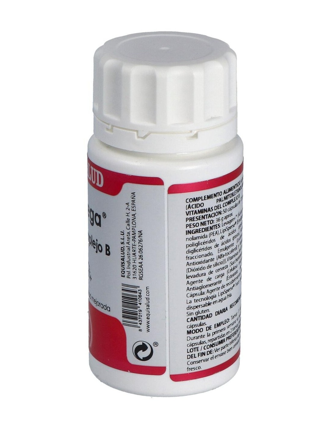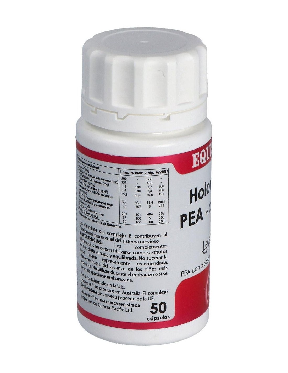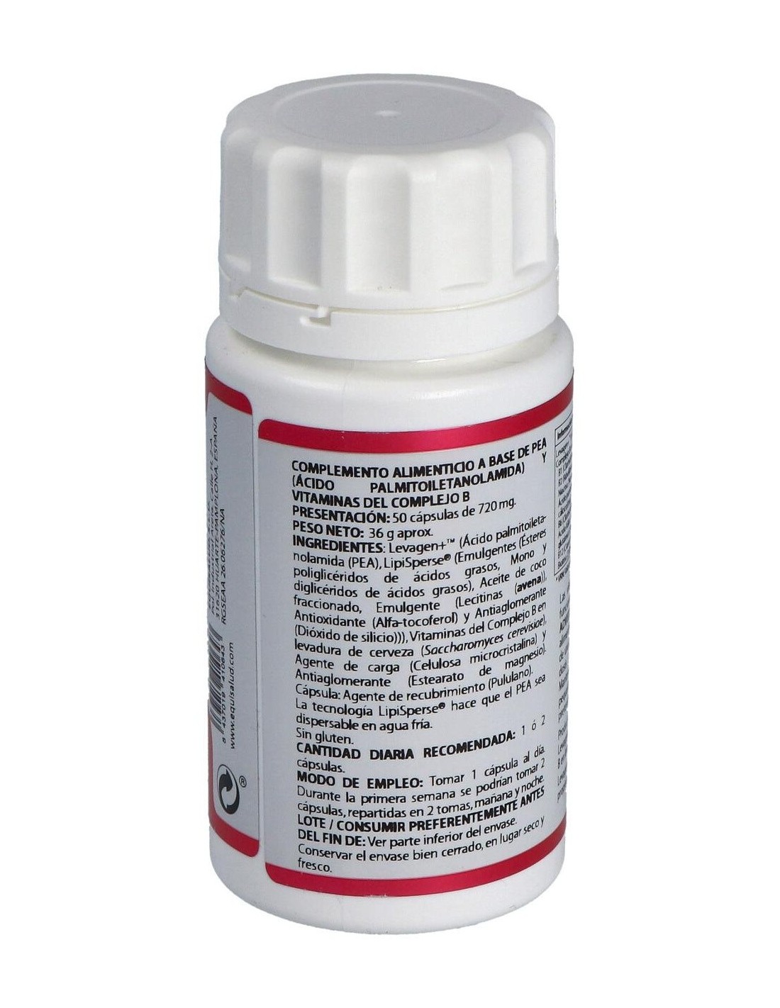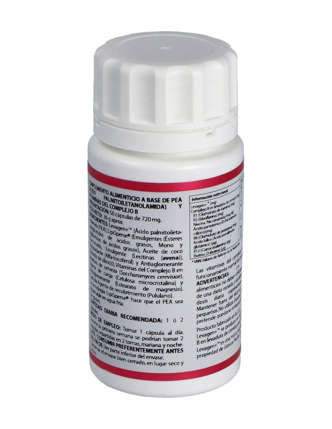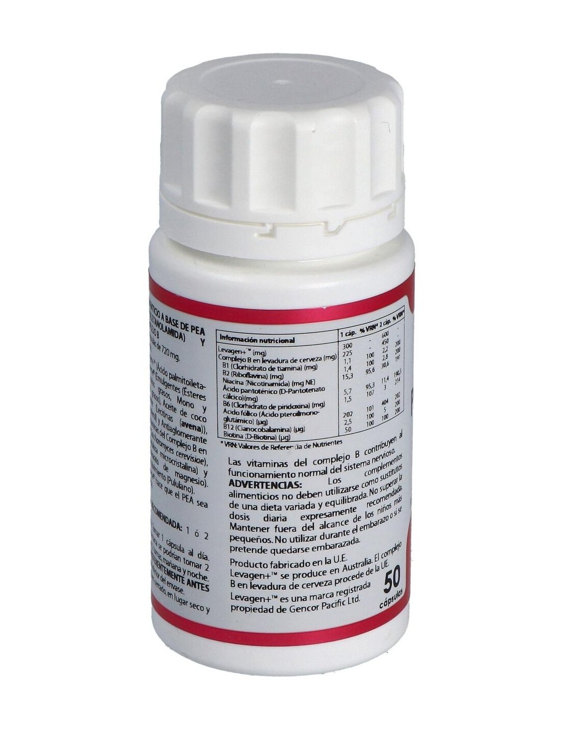 Levagen PlusTM (90 % PEA (Ácido palmitoiletanolamida) y 10% sistema de liberación LipiSperse® (aceite de coco fraccionado, aceite de lima, aceite de oliva virgen extra, emulgentes (polirricinoleato de poliglicerol, lecitinas (avena)) y antioxidante (alfa tocoferol)) 300 mg, Vitaminas del Complejo B (B1 (tiamina clorhidrato) 5.100 ppm, B2 (Riboflavina) 6.100 ppm, niacina (nicotinamida) 68.000 ppm, B5 (D-pantotenato cálcico) 25.400 ppm, B6 (piridoxina clorhidrato) 6.700 ppm, D-biotina 220 ppm, ácido fólico 900 ppm, B12 (cianocobalamina) 11 ppm) en levadura de cerveza (Saccharomyces cerevesiae) 225 mg. Envoltura: polisacárido de origen vegetal (pululano).