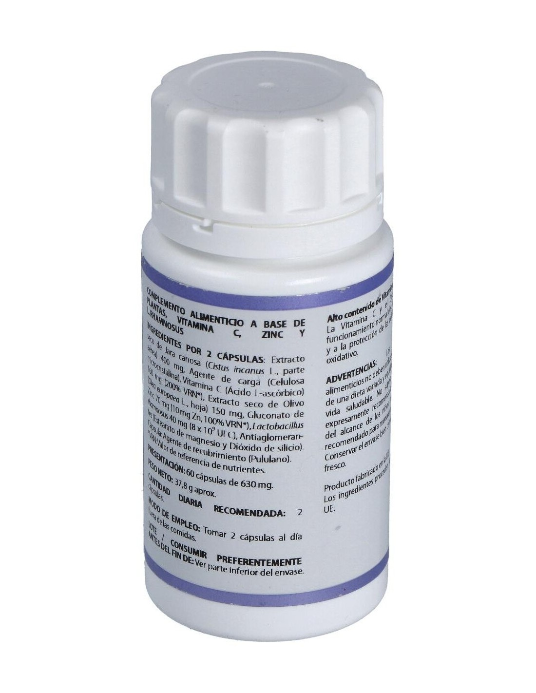 Jara rosa* extracto seco (Cistus x incanus L.), 200 mg: vitamina C (ácido L ascórbico), 80 mg: olivo* extracto seco (Olea europaea L.), 75 mg: gluconato de zinc (14,34% de zinc), 35 mg: polvo Lactobacillus rhamnosus liofilizado 2,0×1011 UFC/g, 20 mg. Envoltura: polisacárido de origen vegetal (pululano).