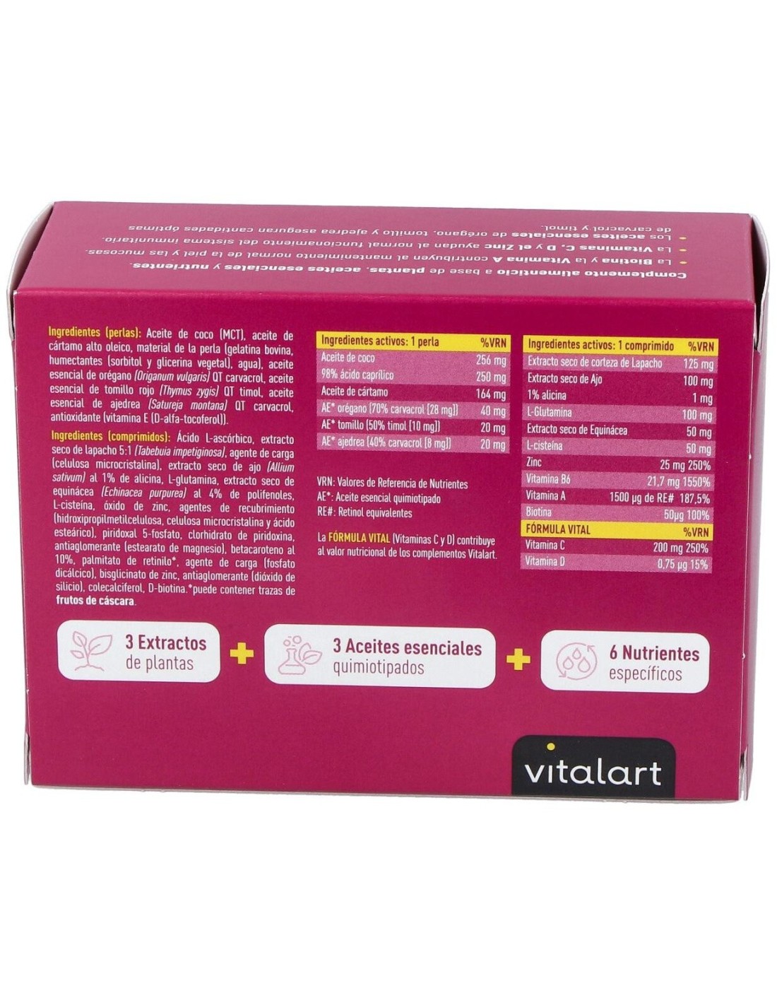 Combina una fórmula en perlas con recubrimiento entérico a base de aceites esenciales quimiotipados (orégano, tomillo y ajedrea) y una fórmula en comprimidos a base de plantas y nutrientes específicos, de acción inmunomoduladora. Estos nutrientes y otros como la biotina y la vitamina A sirven de apoyo al mantenimiento de las mucosas en condiciones normales.