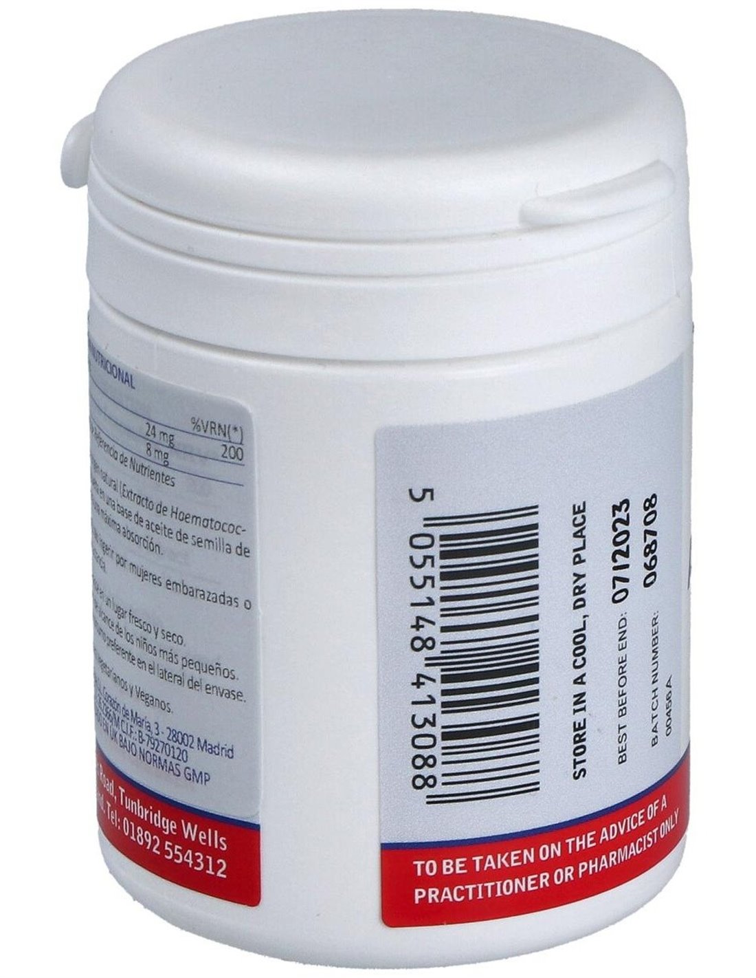Por 2 cápsulas: %VRN(*): Vitamina E 24 mg 200%, Astaxantina 8 mg. *VRN = Valores de Referencia de Nutrientes. A partir de: Extracto de Haematococcus pluvialis.