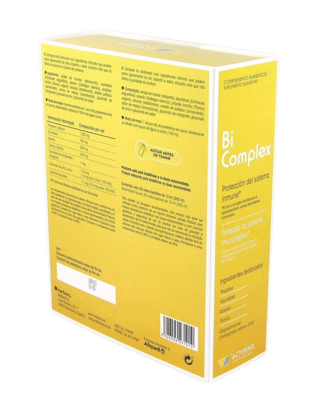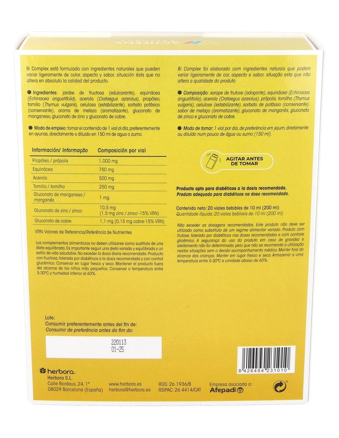 Herbora Bi Complex 20x10ml es un complemento alimenticio en formato vial que ayuda a fortalecer las defensas para prevenir resfriados. Especialmente indicado para el cambio estacional. Este complemento alimenticio combina propóleo con otros ingredientes como la equinácea, tomillo y oligoelementos que tienen propiedades antisépticas e inmunoestimulantes que ayudan a proteger el organismo de agentes externos.