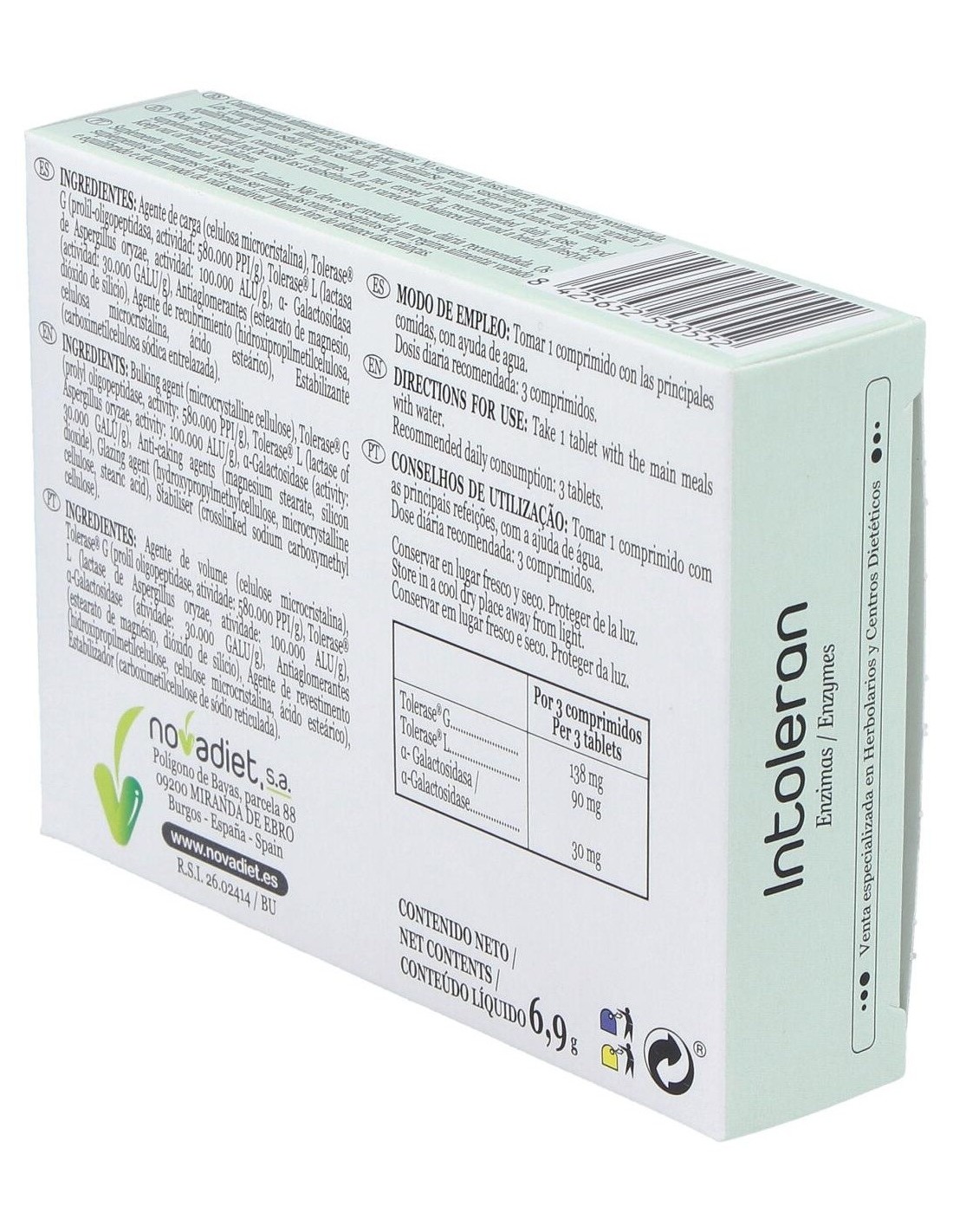 Celulosa microcristalina, Tolerase G (prolil-oligopeptidasa, actividad: 580.000 PPI/g), Tolerase L (lactasa de aspergillus oryzae, actividad: 1000 ALU/g), galactosidasa (actividad: 30.000 GALU/g), estearato de magnesio, dióxido de silicio, hidroxipropilmetilcelulosa, celulosa microcristalina, ácido esteárico, carboximetilcelulosa sódica entrelazada.