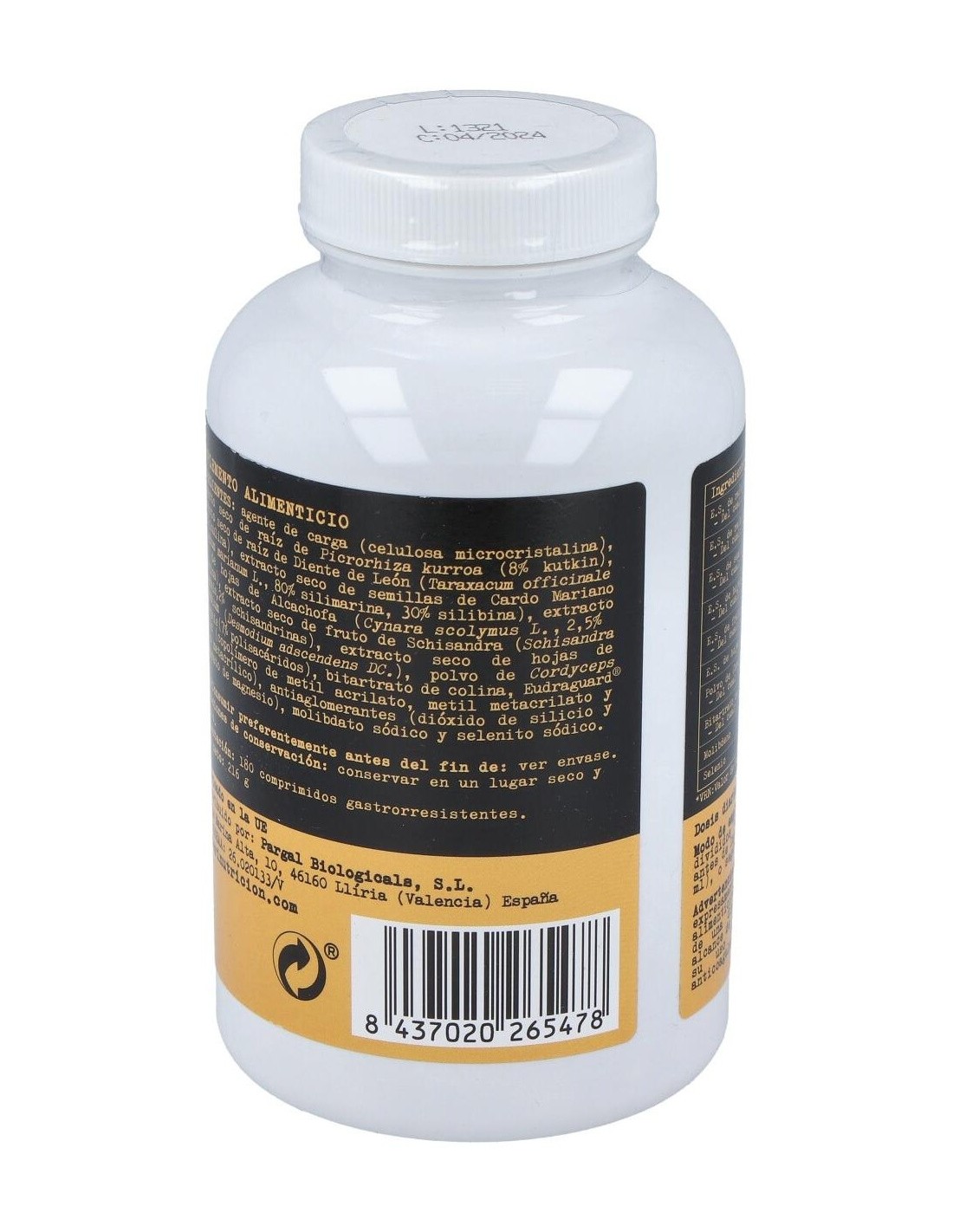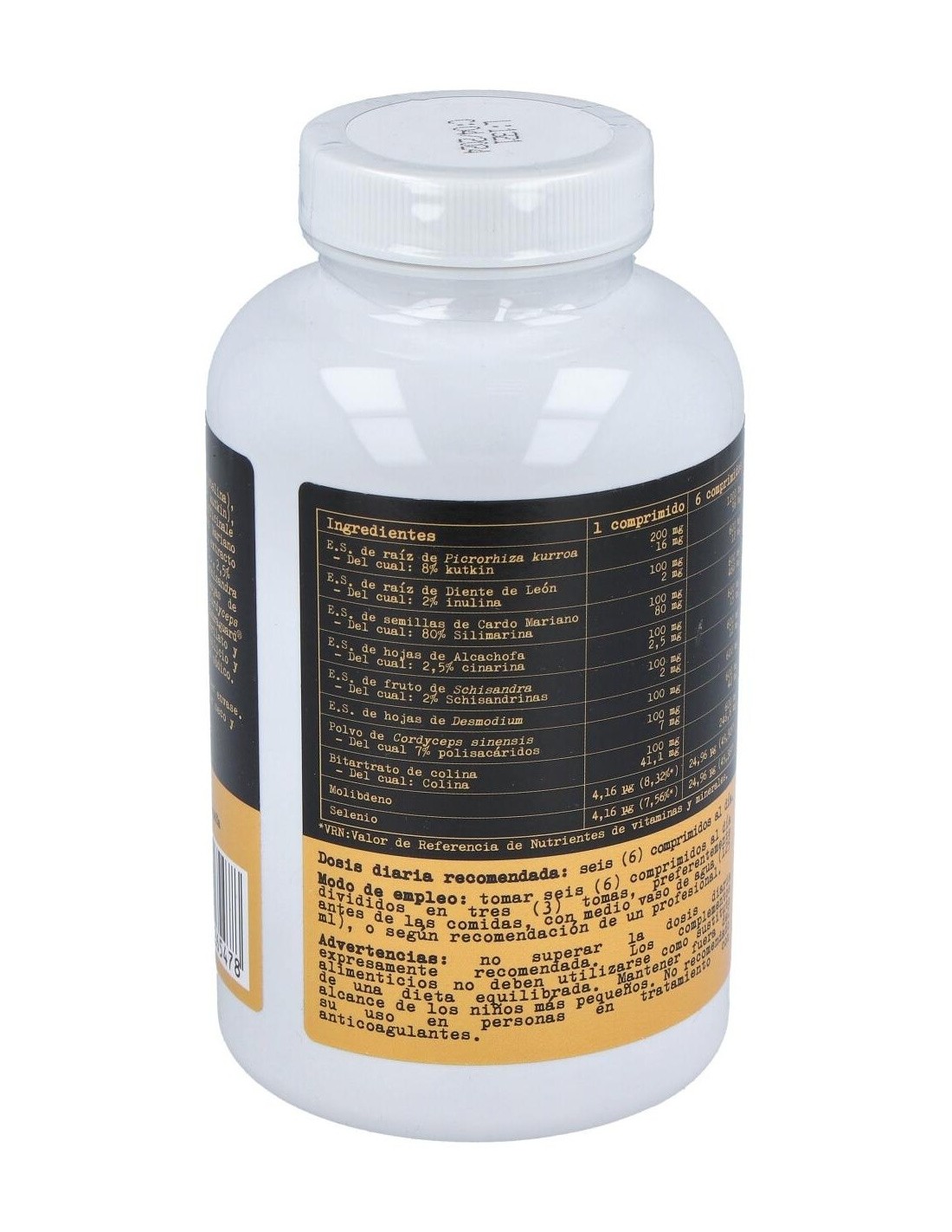 Agente de carga (celulosa microcristalina), extracto seco de raíz de Picrorhiza kurroa (8% kutkin), extracto seco de raíz de Diente de León (Taraxacum officinale L., 80% silimarina, 30% silibina), extracto seco de hojas de Alcachofa (Cynara scolymus L., 2,5% cinarina), extracto seco de fruto de Schisandra (Schisandra chinensis, 2% schisandrinas), extracto seco de hojas de Desmodium (Desmodium adscendens DC.), polvo de Cordyceps sinensis (7% polisacáridos), bitartrato de colina, Eudraguard© biotic (copolímero de metil acrilato, metil metacrilato y ácido metacrílico), antiaglomerantes (dióxido de silicio y estearato de magnesio), molibdato sódico y selenito sódico.