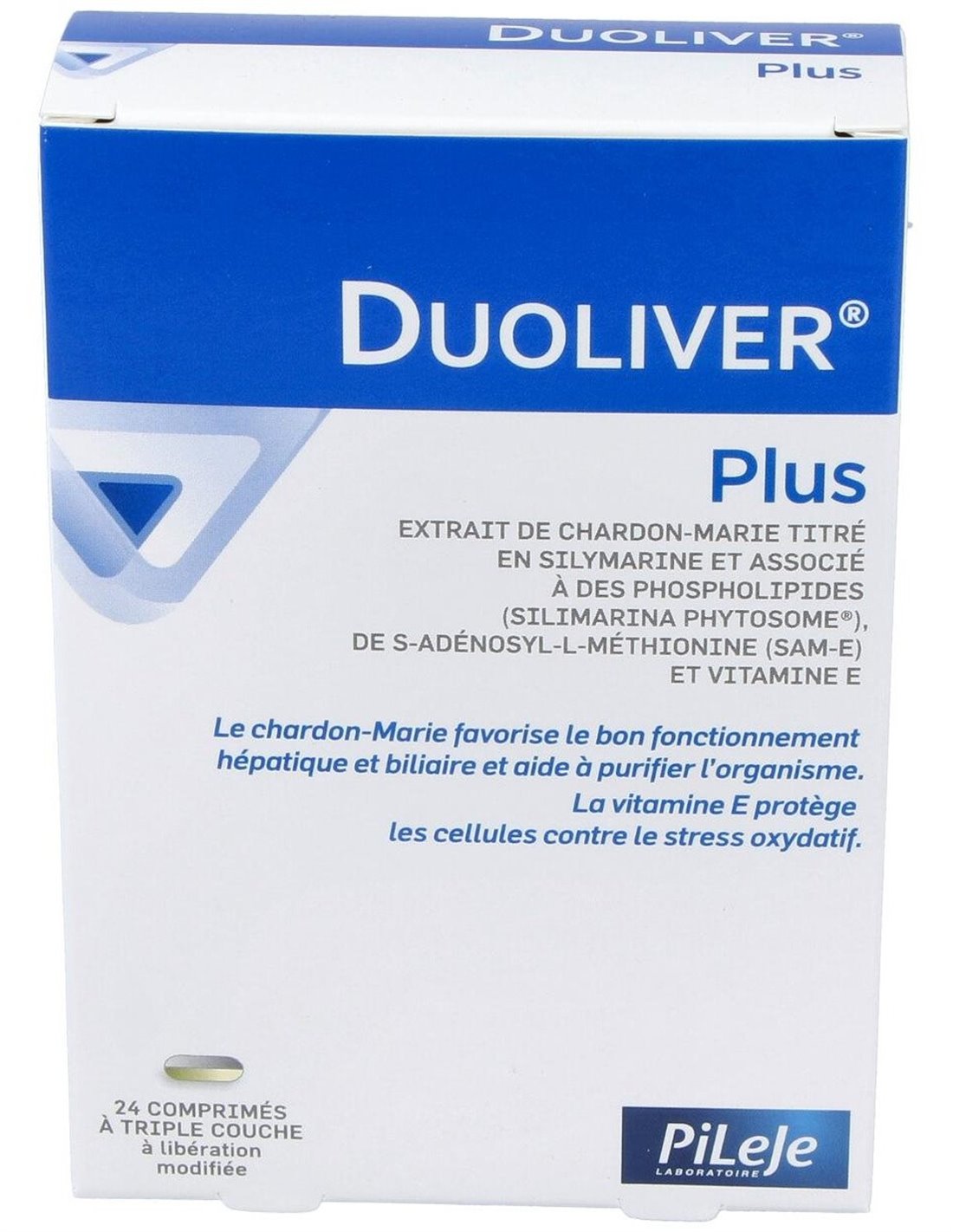 El cardo mariano es útil para mantener las funciones fisiológicas de purificación. La vitamina E protege las células contra el estrés oxidativo. Comprimidos tricapa de liberación modificada.