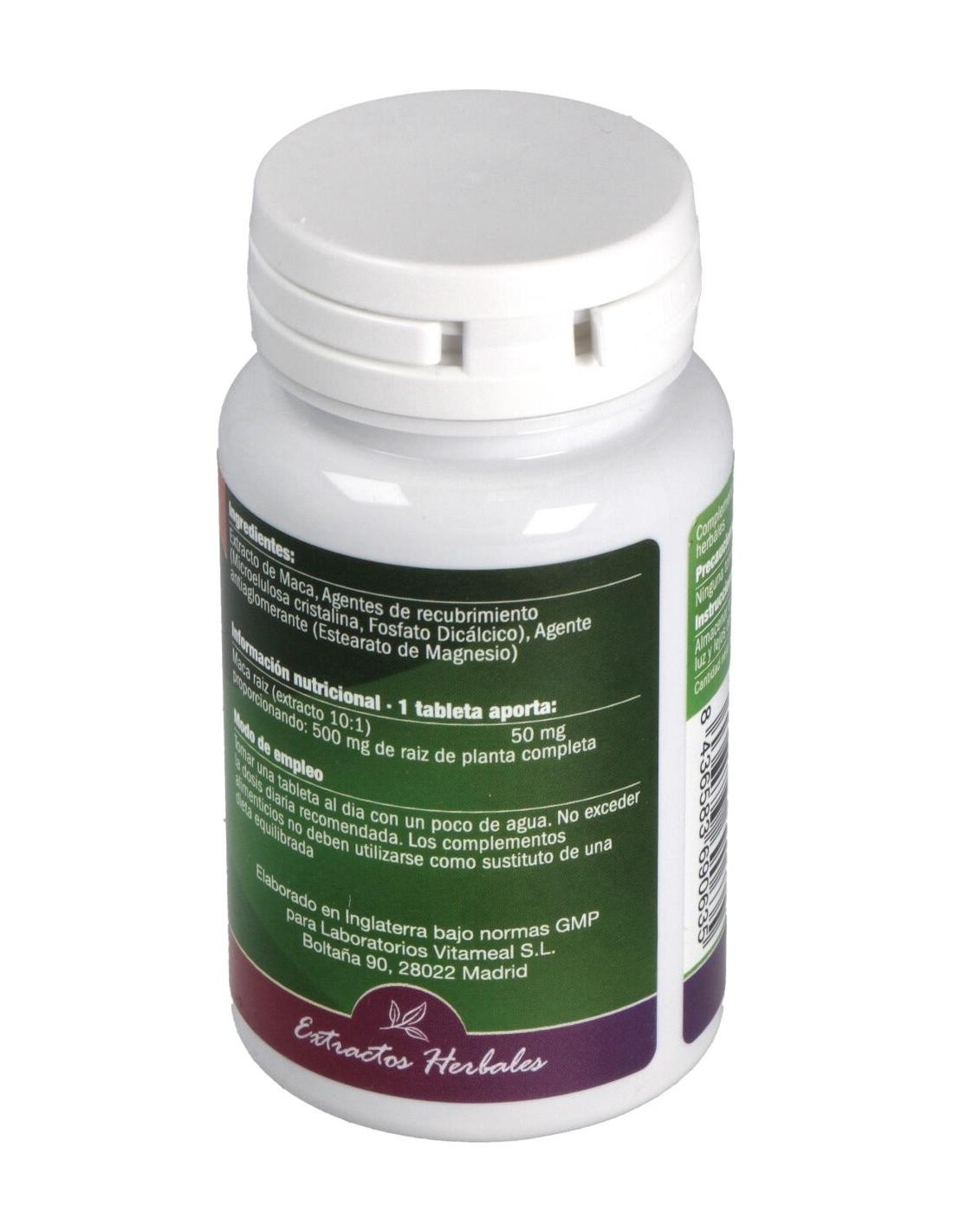 Maca (extracto 10:1) 50 mg proporcionando 500 mg. Celulosa, Fosfato Dicálcico, Estearato de Magnesio.