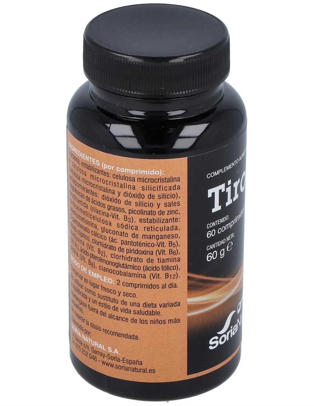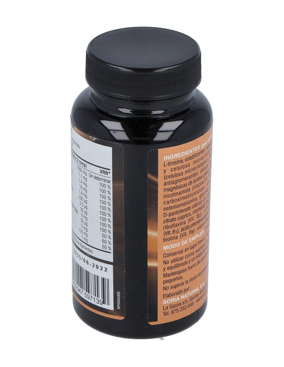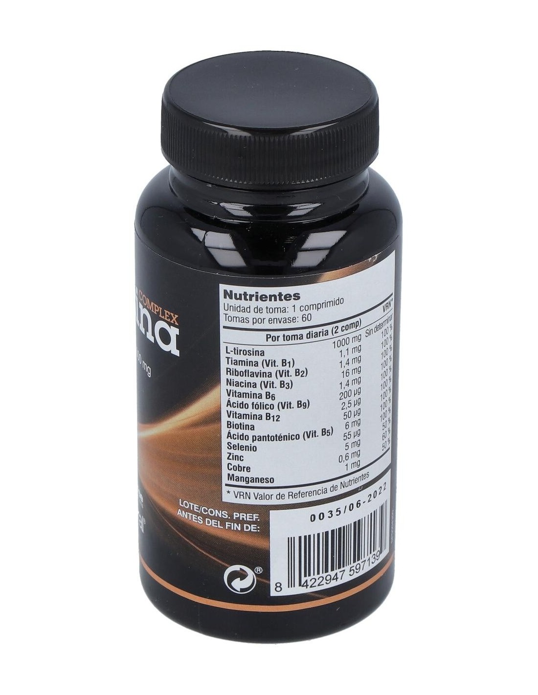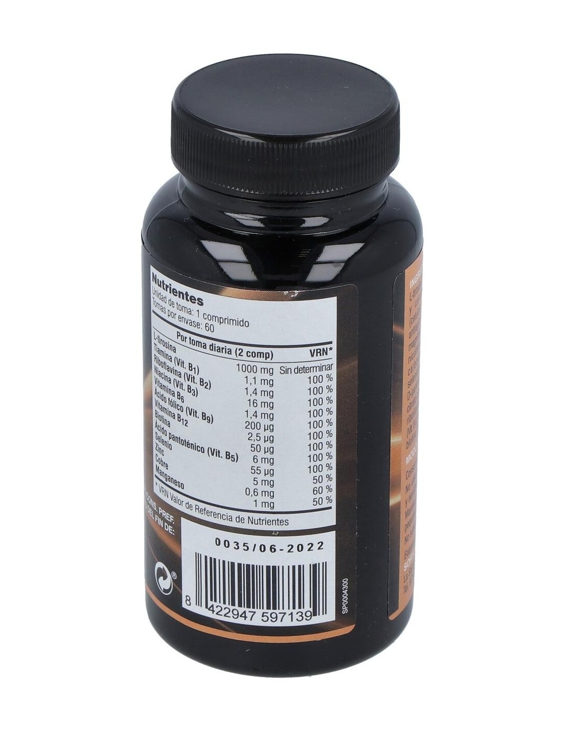 L-Tirosina, Clorhidrato de tiamina, Riboflavina, Niacinamida, Clorhidrato de piridoxina, Ácido fólico, Cianocobalamina, Biotina, Pantotenato cálcico, Ácido L-ascórbico, Selenio, Cobre, Zinc, Manganeso, Estabilizador: Celulosa microcristalina, Hidroxipropilcelulosa, Antiaglomerante: Dióxido de silicio, Disgregante: Croscarmelosa sódica, Sal magnésica de ácidos grasos: Estearato de magnesio.