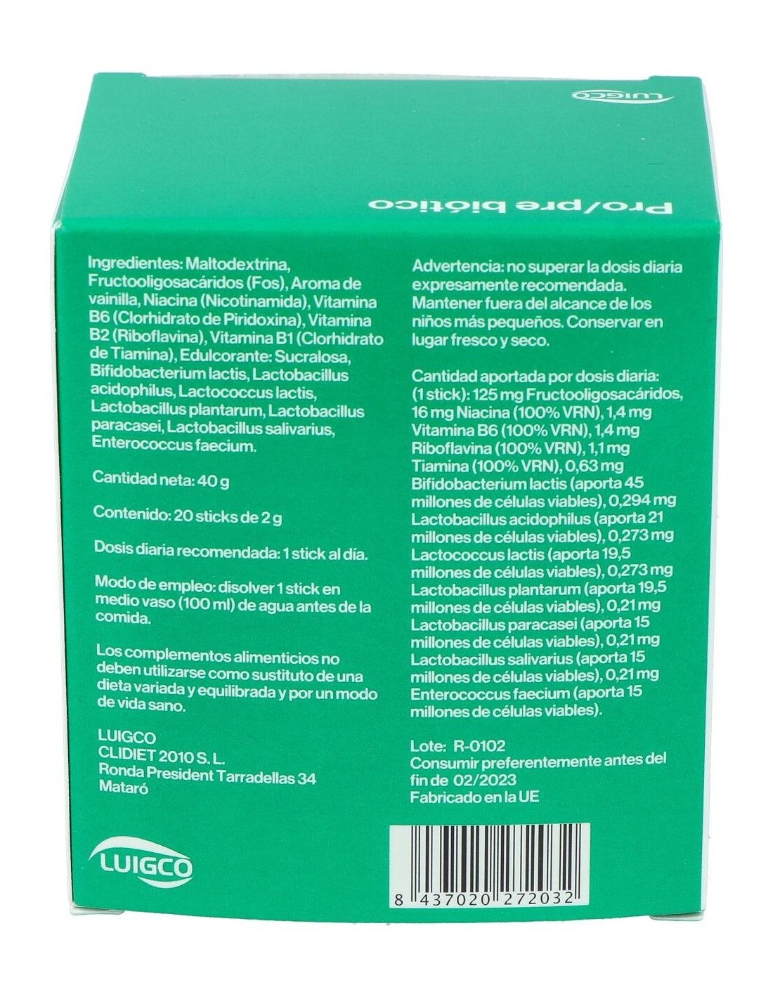 (150 millones UFC) Lactobacoccus lactis, Lactobacillus paracasei, Lactobacillus plantarum, lactbacillus acidophilus, lactobacillus salivarius, Bifido bacterium lactis, Enterococcus faecium.