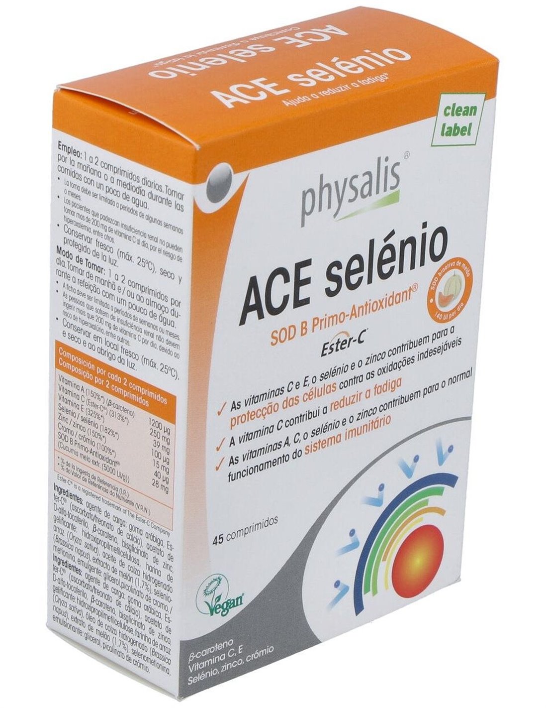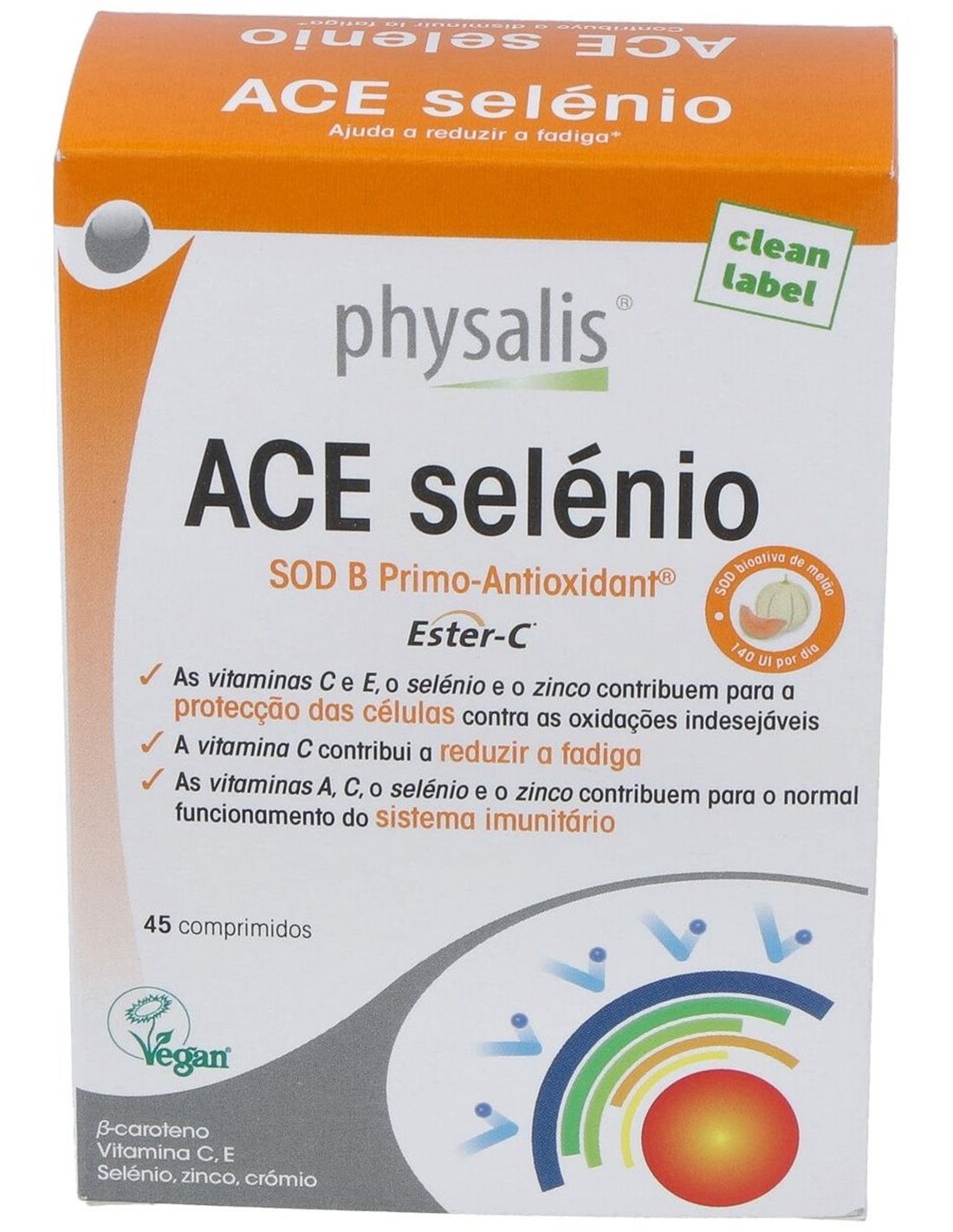 Vitamina A (ß-caroteno) 1200µg, Vitamina C (Ester-C®) 250mg, Vitamina E 39mg, Selenio 100µg, Zinc 15mg, Chromo 40µg, SOD B Primo-Antioxidant®