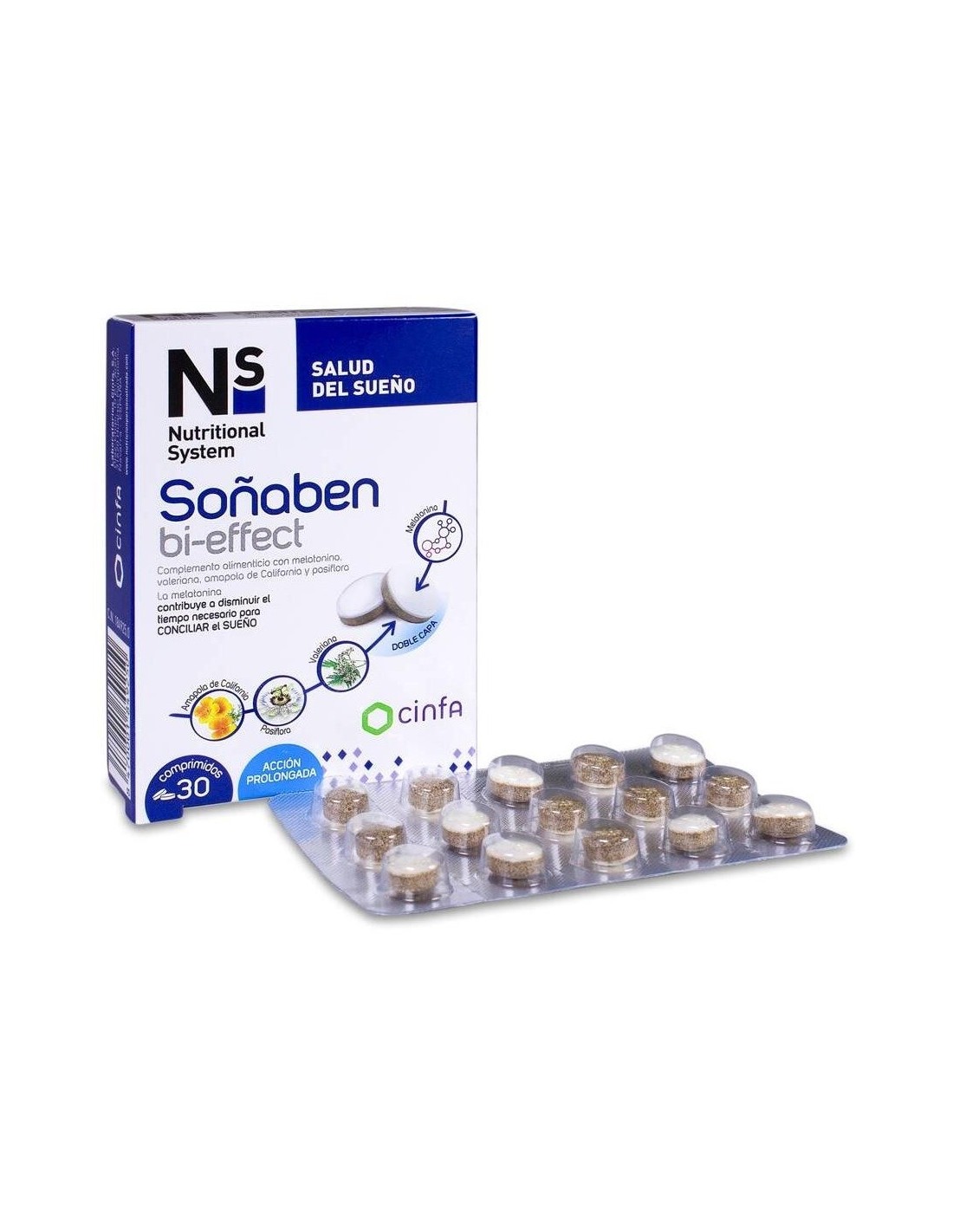 Producto que incorpora una novedosa tecnología que permite crear comprimidos bicapa, controlando la liberación de cada componente en el momento adecuado del sueño. La melatonina se libera al principio para ayudar a conciliar el sueño y la pasiflora, valeriana y amapola de california se libera posteriormente para ayudar a tener un sueño reparador y de calidad.
