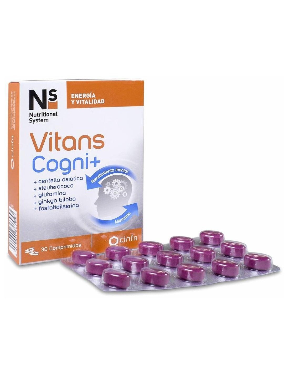 Estabilizante: celulosa microcristalina; extracto seco de Centella asiática, parte aérea (10% triterpenos totales) (Centella asiatica); extracto seco de Eleuterococo, raíz (2% eleuterósidos) (Eleutherococcus senticosus); L-glutamina; extracto seco de Ginkgo, hojas (Ginkgo biloba); lecitina de soja (20% fosfatidilserina); estabilizantes: carboximetilcelulosa sódica entrelazada, hidroxipropilcelulosa; sulfato de zinc; antiaglomerante: dióxido de silicio; nicotinamida (Niacina); agente de recubrimiento: polietilenglicol 6000; estabilizante: estearato de magnesio; clorhidrato de piridoxina (vitamina B6); clorhidrato de tiamina (vitamina B1); ácido pteroilmonoglutámico (Ácido Fólico); cianocobalamina (vitamina B12). Cobertura: estabilizantes: hidroxipropilmetilcelulosa, celulosa microcristalina; aroma; humectante: glicerol; antiaglomerante: ácido esteárico. \ \ Por comprimido: \ Extracto seco de Centella asiática: 200 mg Extracto seco de Eleuterococo: 150 mg L glutamina: 100 mg Extracto seco de Ginkgo: 90 mg Fosfatidilserina: 15 mg Vitamina B1: 1,1 mg Vitamina B3: 16 mg Vitamina B6: 1,4 mg Ácido Fólico: 200 mg Vitamina B12: 2,5 mg Zinc: 10 mg