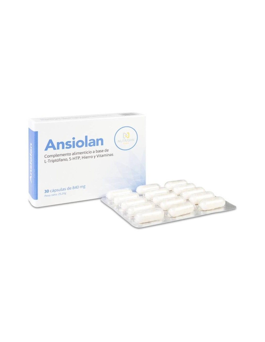 Nutrasan Ansiolan 30caps es un complemento alimenticio en formato cápsula, elaborado a base de L-Triptófano, 5-HTP, hierro y vitaminas del grupo B, que favorece la mejora del estado de ánimo.