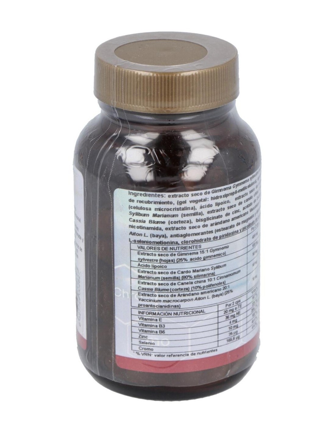 Gymnema silvestre (E. estandarizado 25% ácidos gimnémicos), Extracto seco de Canela china (Cinnamomum cassia) DT2 10:1, Extracto de mirtilo 25% antocianidinas (vaccinium myrtillus), Picolinato de Cromo (equiv. a 100 mg. de Cr elemental), Zinc bisglicinato, Vitamina E (alfa tocoferol acetato equiv. a 10 mg. alfa-TE), Vitamina B 6 (Piridoxina), Vitamina B3 (Niacinamida), Seleniometionina (equiv. a Se elemental 25 mcg.), Acido alfa lipoico, Extracto cardo mariano (80% silimarina).