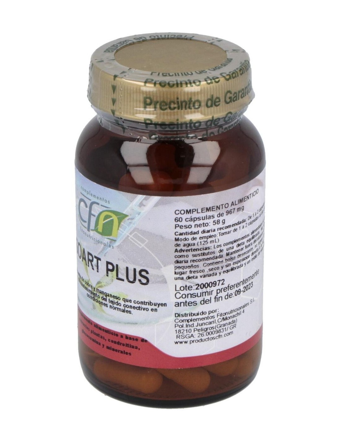 Sulfato de glucosamina 300 mg; Metil sulfonil metano (MSM) 200 mg; Sulfato de Condroitina 100 mg;. Manganeso (aminoquelado) 0,5 mg; Cobre aminoquelado 0,25 mg; Zinc (aminoquelado) 17% CDR 2,5 mg; Ext. estandarizado de Curcuma longa 90 mg; Ext. estandarizado de Jengibre 40 mg; Ext. estandarizado de Harpagofito 90 mg.