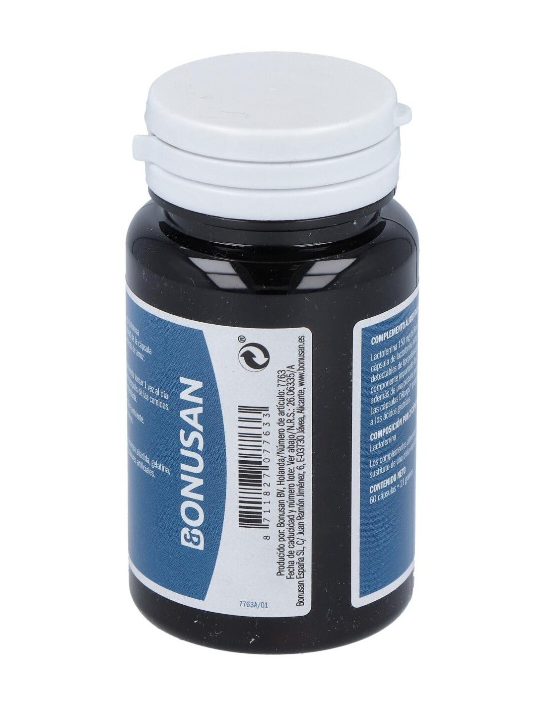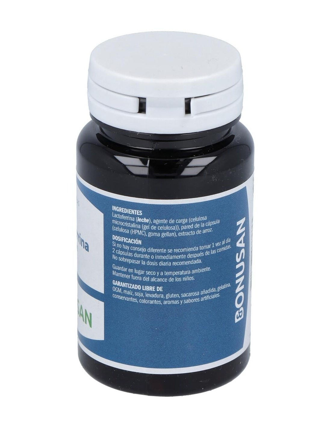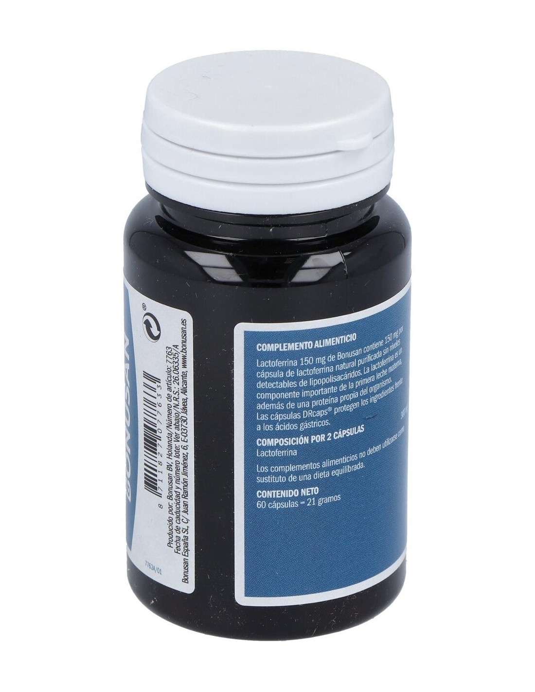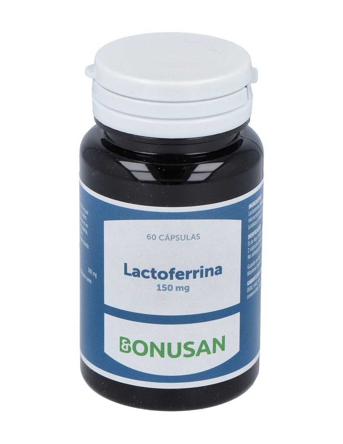 Lactoferrina 150 mg Aditivos: Agente de carga (celulosa microcristalina), celulosa (HPMC), antiaglomerantes (estearato de magnesio).