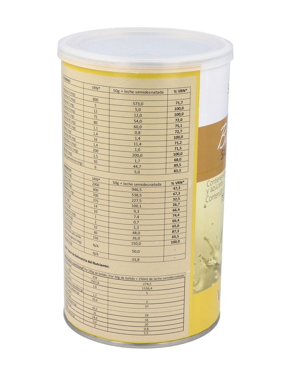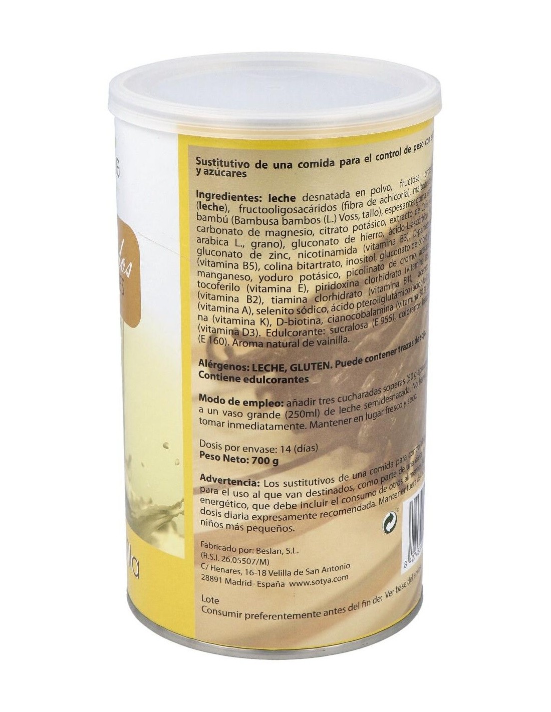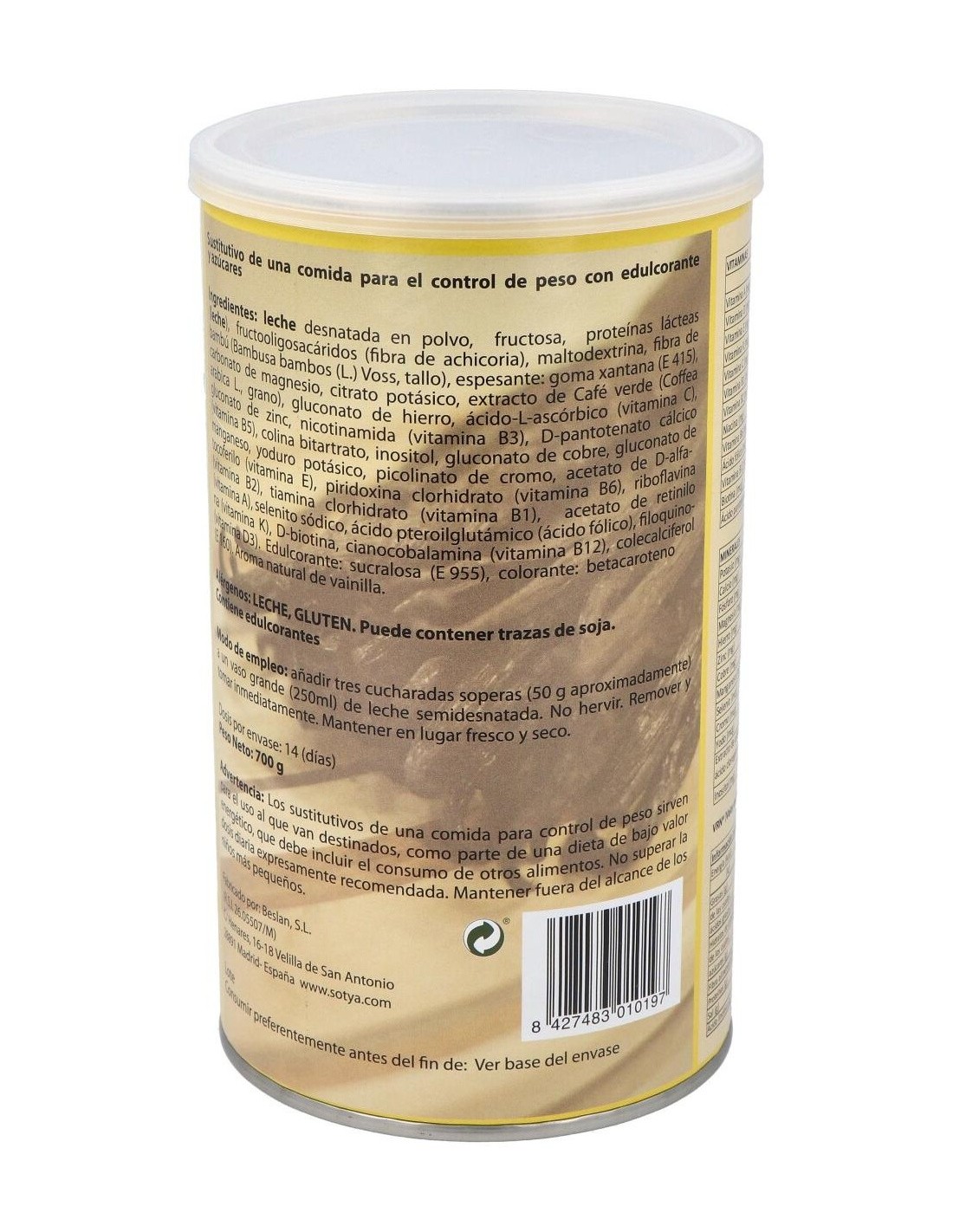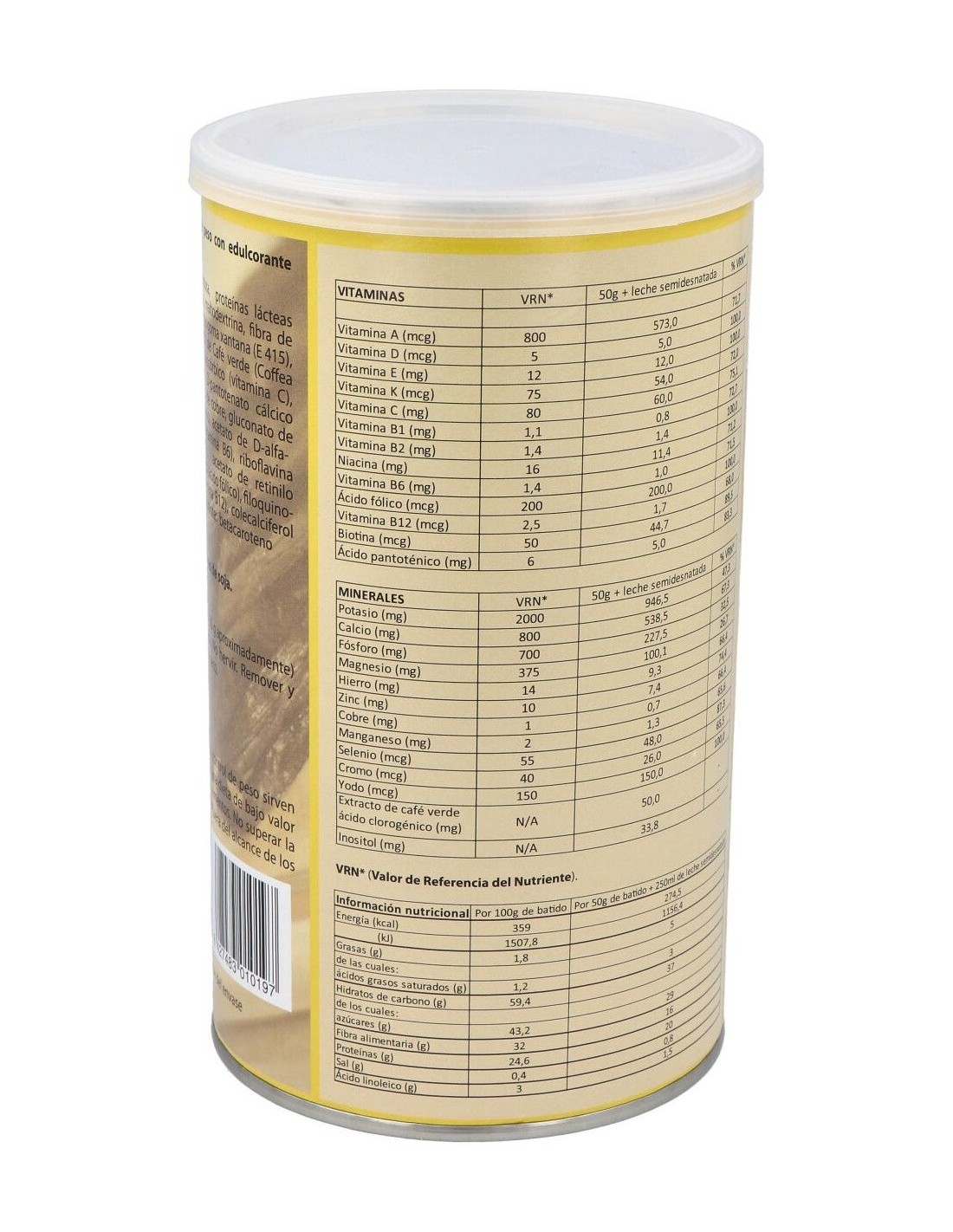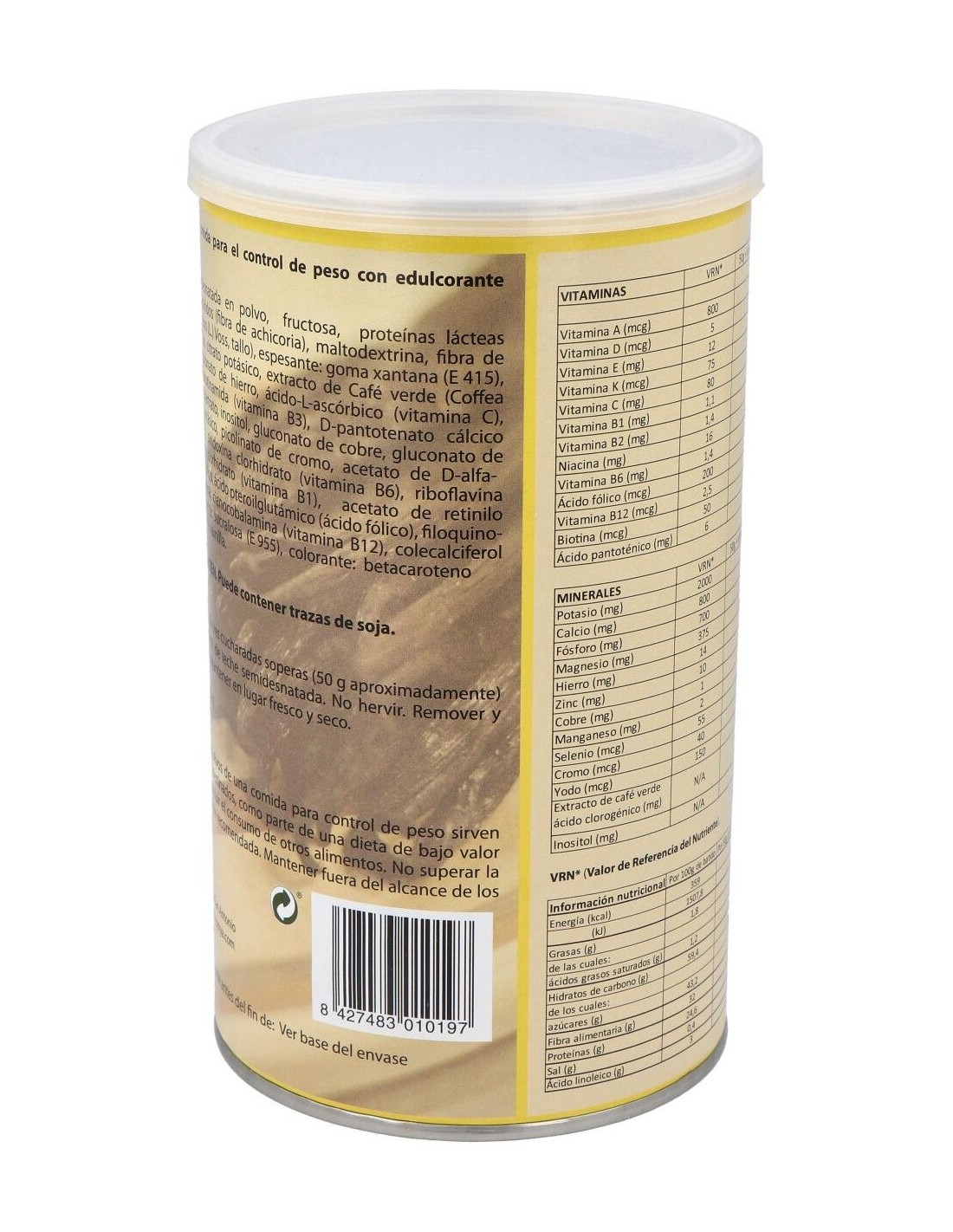 Leche desnatada en polvo, fructosa, proteínas lácteas (leche), fructooligosacáridos (fibra de achicoria), maltodextrina, fibra de bambú (Bambusa bambos (L.) Voss, tallo), espesante: goma xantana (E415), carbonato de magnesio, citrato potásico, extracto café verde (Coffea arabica L., grano), gluconato de hierro, ácido L-ascórbico (vitamina C), gluconato de zinc, nicotinamida (vitamina B3), D-pantotenato cálcico (vitamina B5), colina bitartrato, inositol, gluconato de cobre, gluconato de manganeso, yoduro potásico, picolinato de cromo, Acetato de D-alfa tocoferilo (vitamina E), piridoxina clorhidrato (vitamina B6), riboflavina (vitamina B2), tiamina clorhidrato (vitamina B1), acetato de retinilo (vitamina A), selenito sódico, ácido pteroilglutámico (ácido fólico), filoquinona (vitamina K), D-biotina, cianocobalamina (vitamina B12) y colecalciferol (vitamina D3). Edulcorante: sucralosa (E955). Colorante Betacaroteno (E160). Aroma natural de vainilla.