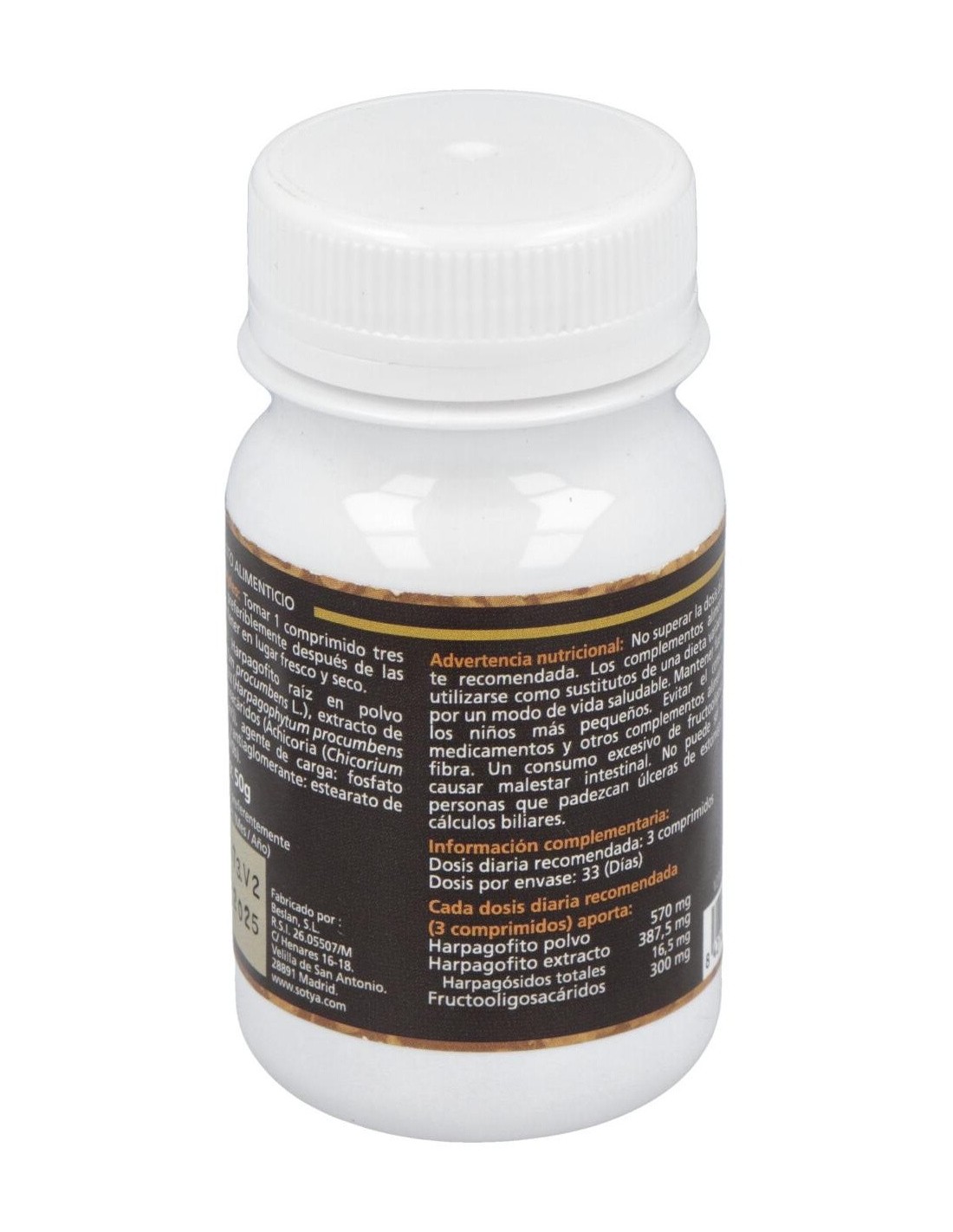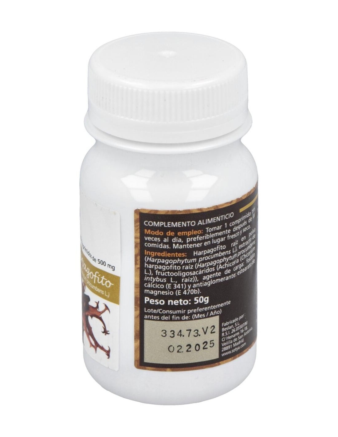 100 comprimidos de 500mg, con 300mg de harpagofito (Harpagophytum procumbens L.), 50mg extracto estandarizado de harpagofito (equivalente a 200mg de planta). Excipientes.