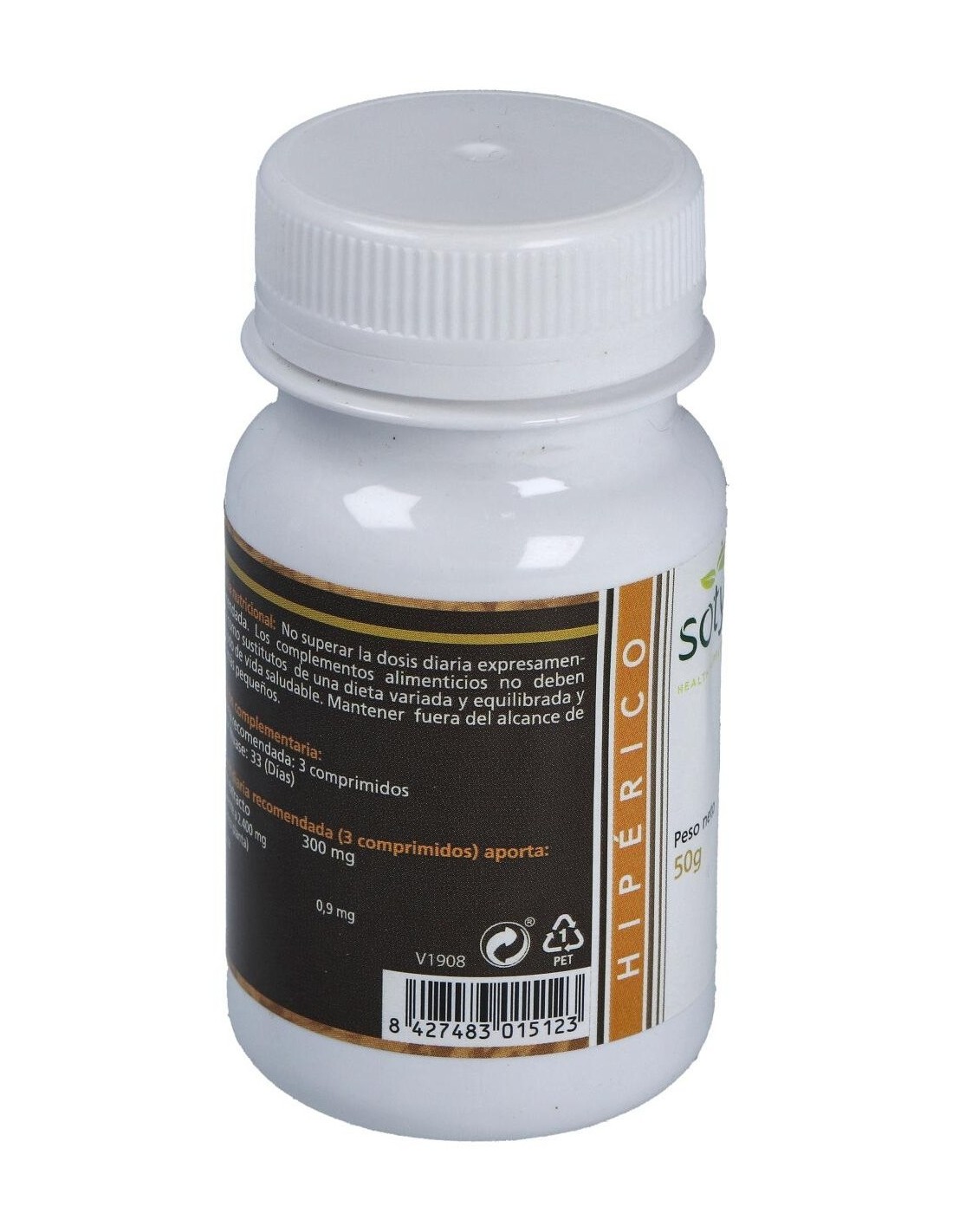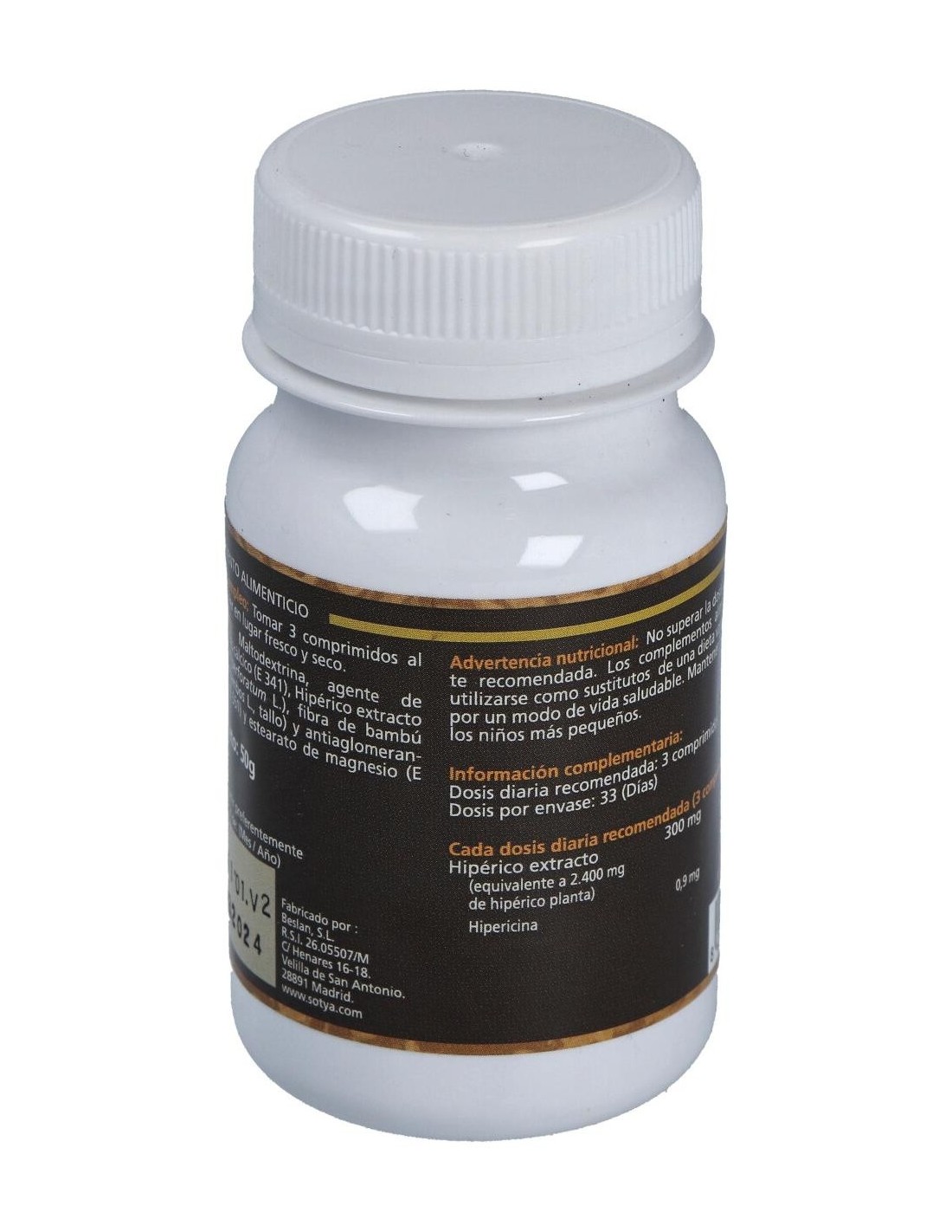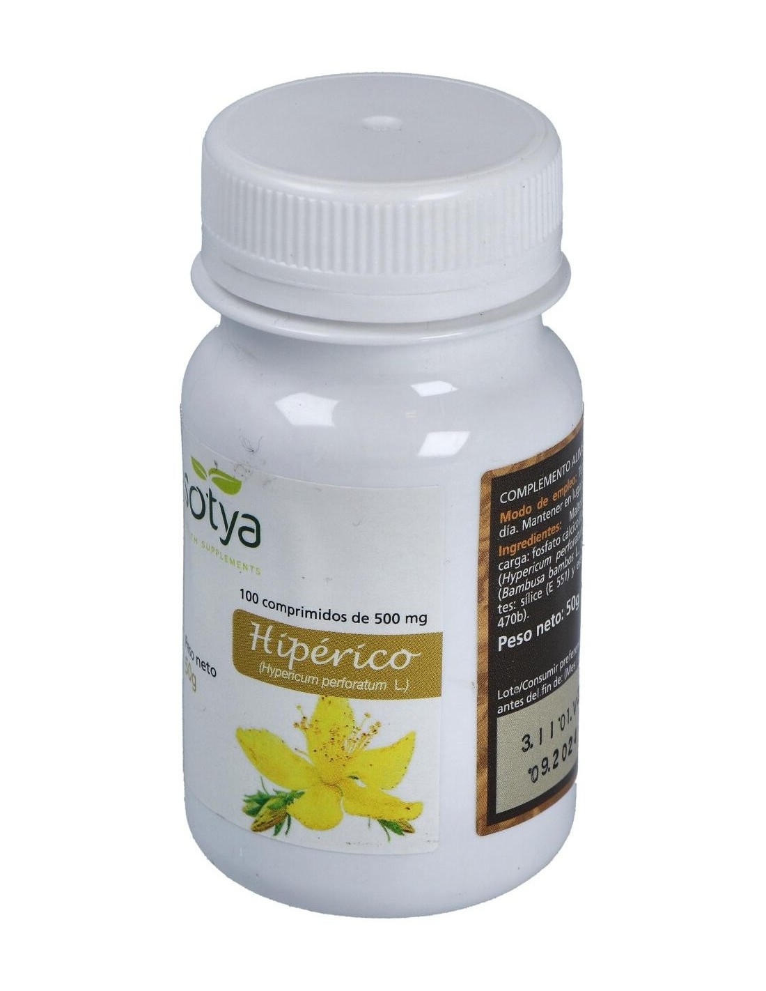 100 comprimidos de 500mg, con 100mg de extracto de hipérico (Hypericum perforatum), con mínimo 0,3% hipericina, maltodextrina, fosfato dicálcico, y como antiaglomerantes: celulosa y sílice.