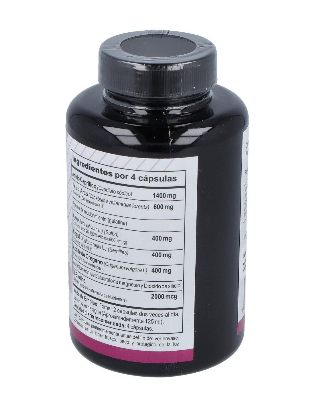 Composición por 4 cápsulas: Ácido caprílico: 1400 mg, Pau darco (corteza) (extracto seco 4:1) 600 mg, Ajo (bulbo) (extracto seco 25:1) 400 mg, Nogal (semillas) (extracto seco 10:1) 400 mg, Aceite de orégano (polvo) (2% aceite esencial) 400 mg, Dbiotina 2000 mcg, Estearato de magnesio, dióxido de silicio, gelatina. *Puede contener trazas de alérgenos.