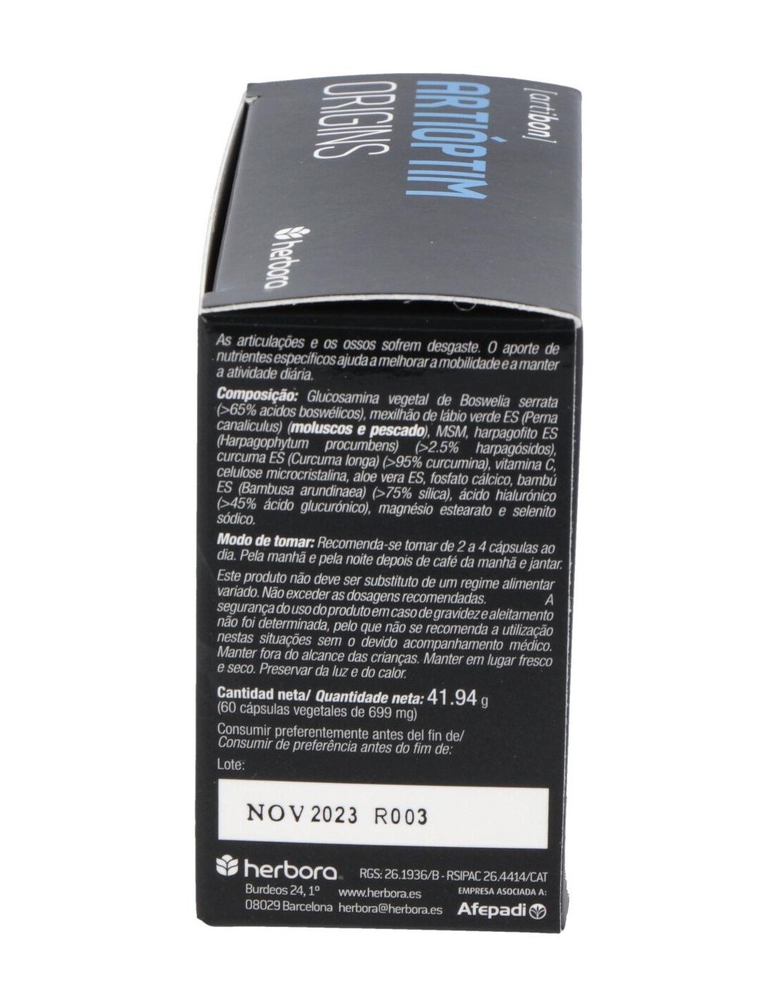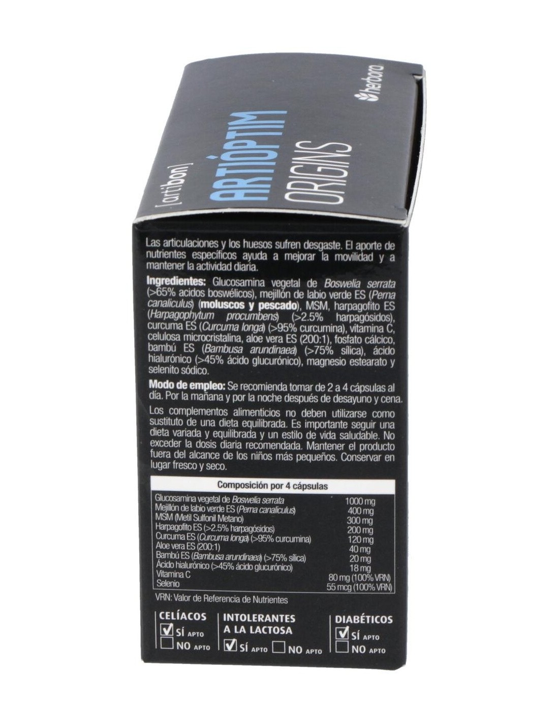 Glucosamina vegetal de Boswelia serrata 1000 mg, Mejillón de labio verde 400 mg, MSM 300 mg, Harpagofito ES (>2.5% harpagósidos) 200 mg, Cúrcuma ES (>95% curcumina) 120 mg, Aloe vera ES (200:1) 40 mg, Silicio orgánico de Bambú (>75% sílice) 20 mg, Ácido hialurónico (>45% ácido glucurónico) 18 mg, Vitamina C (ácido ascórbico) 80 mg, Selenio 55 mcg. Celulosa microcristalina, fosfato de calcio y magnesio estearato.