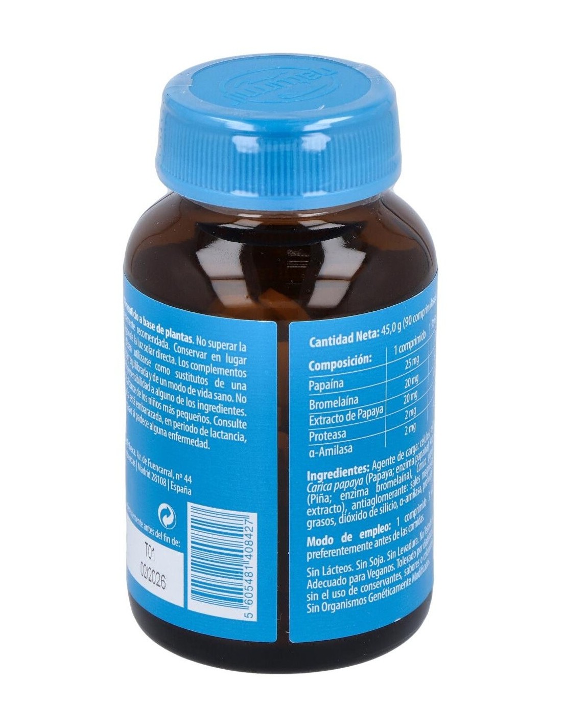 Agente de carga: celulosa microcristalina, antiaglomerante: estearato de magnesio, Carica papaya (Papaya: enzima papaína), Ananas conosus (Piña: enzima bromelaína), Carica papaya (Papaia: extracto), antiaglomerante: dióxido de silicio, proteasa, a amilasa.