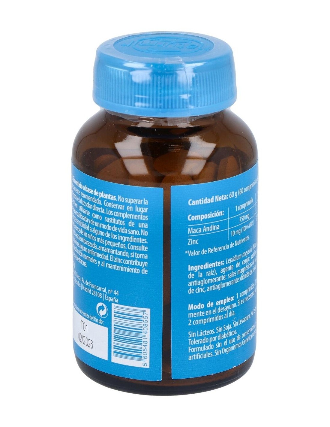 Lepidium meyenii (Maca Peruana: extracto de la raíz), agente de carga: celulosa microcristalina, antiaglomerante: estearato de magnesio, óxido de zinc, antiaglomerante: dióxido de silicio.