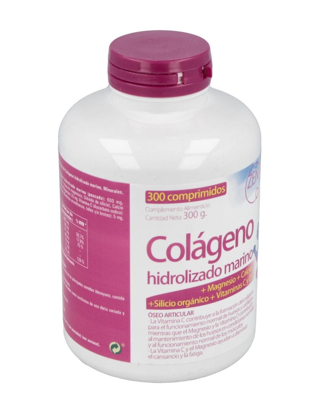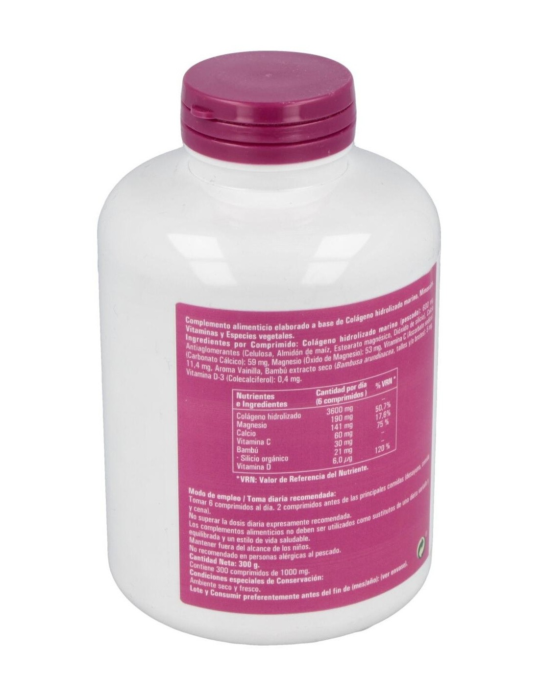 Complemento alimenticio que ayuda a combatir la formación el colágeno el organismo. El magnesio ayuda a aumentar la producción natural de colágeno en el organismo, interviniendo en el momento de mantener el correcto funcionamiento de los órganos y ayudando a activar nuestro sistema muscular a través de la producción de energía. Compuesto a base de colágeno hidrolizado marino, minerales, vitaminas y especies vegetales. Formato de 300 cápsulas.