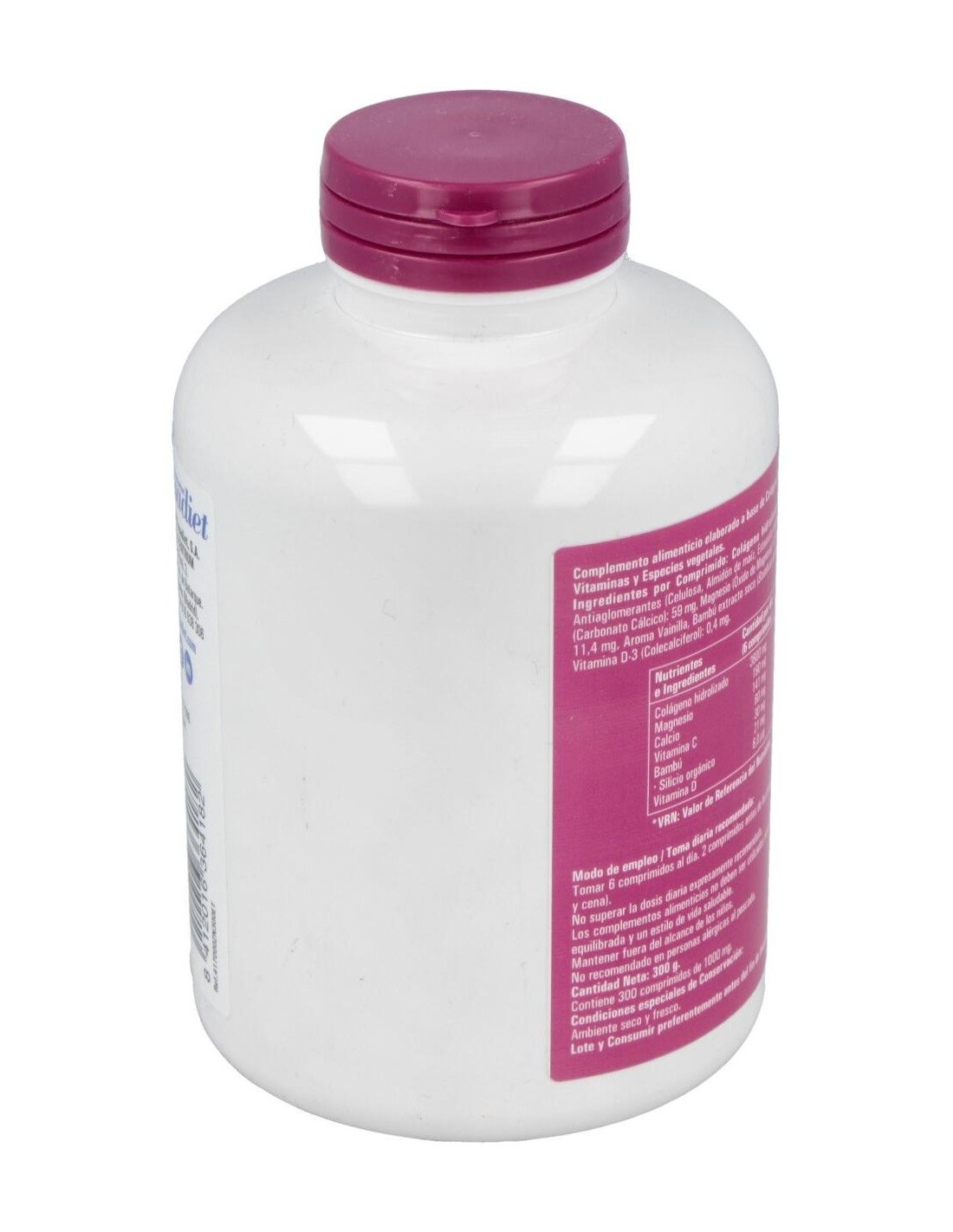 Colágeno Hidrolizado Marino (Pescado): 600 mg, Calcio (Carbonato Cálcico): 59 mg, Magnesio (Óxido De Magnesio): 53 mg, Vitamina C (Ácido L-Ascórbico): 10 mg, Aroma Vainilla, Bambú Extracto Seco (Bambusa Arundinacea, Tallos y/o Brotes): 5 mg, Vitamina D-3 (Colecalciferol): 0,4 mg.