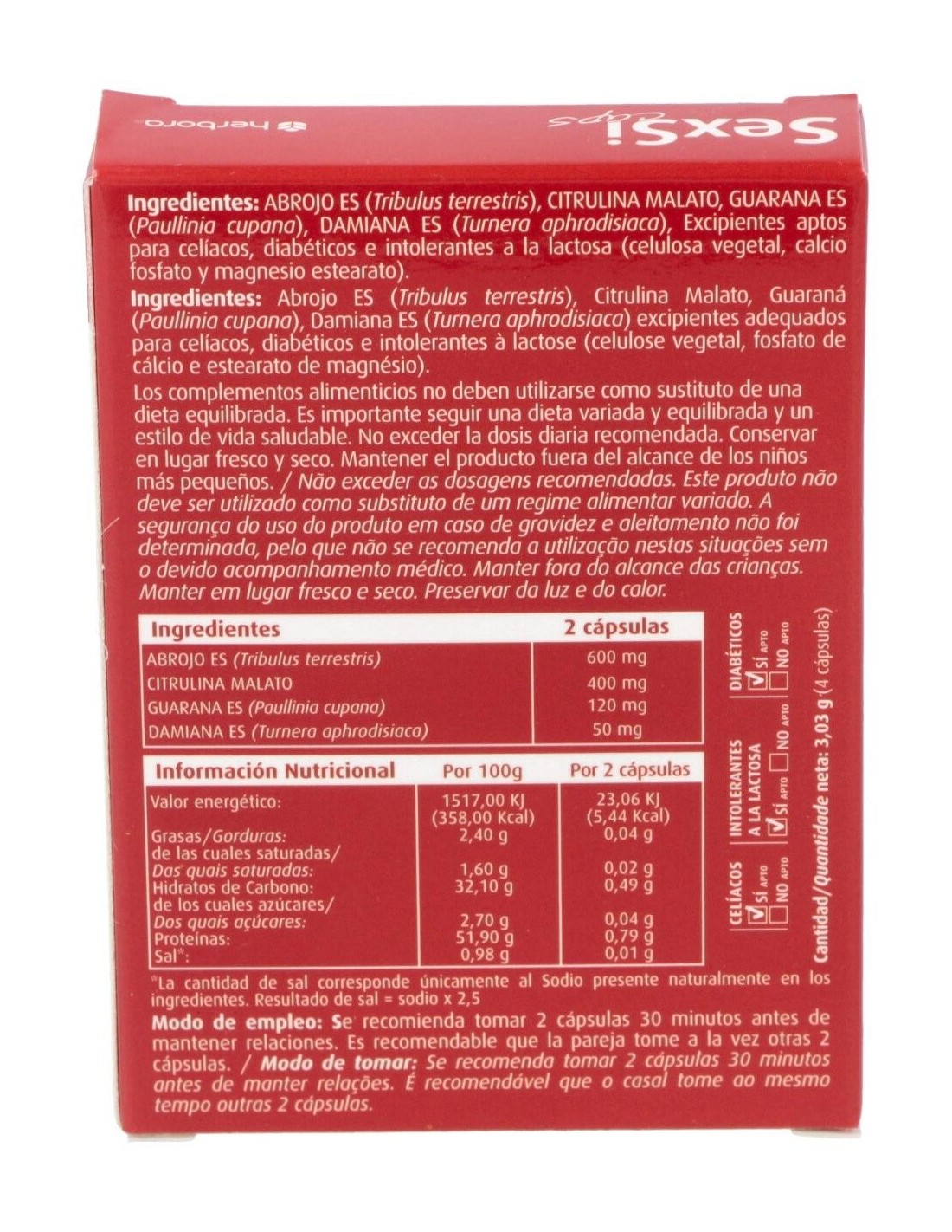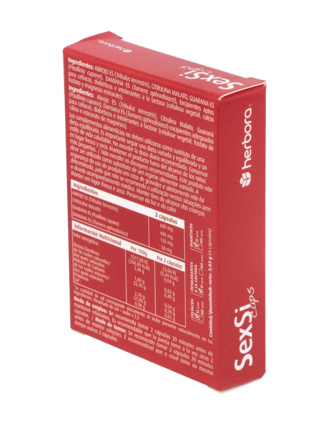 Herbora SexSi 4Cáps suplemento tanto para hombres como para mujeres que está formulado a base de 3 plantas; abrojo, guaraná y damiana y citrulina que es precursor de la arginina, un aminoácido esencial para nuestro organismo. Indicado en momentos que se quiere disfrutar más y aumentar la intensidad de las relaciones en pareja y el deseo sexual. Optimiza las funciones de satisfacción en pareja.