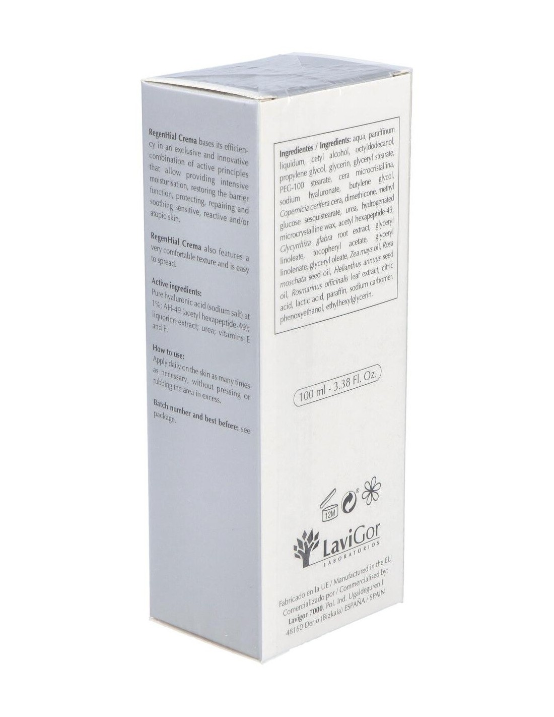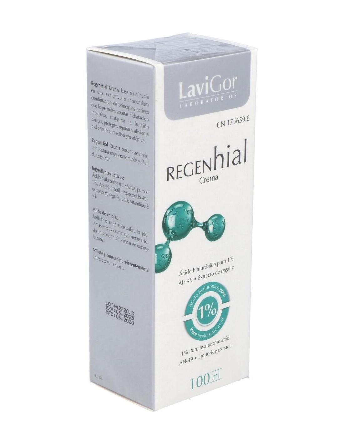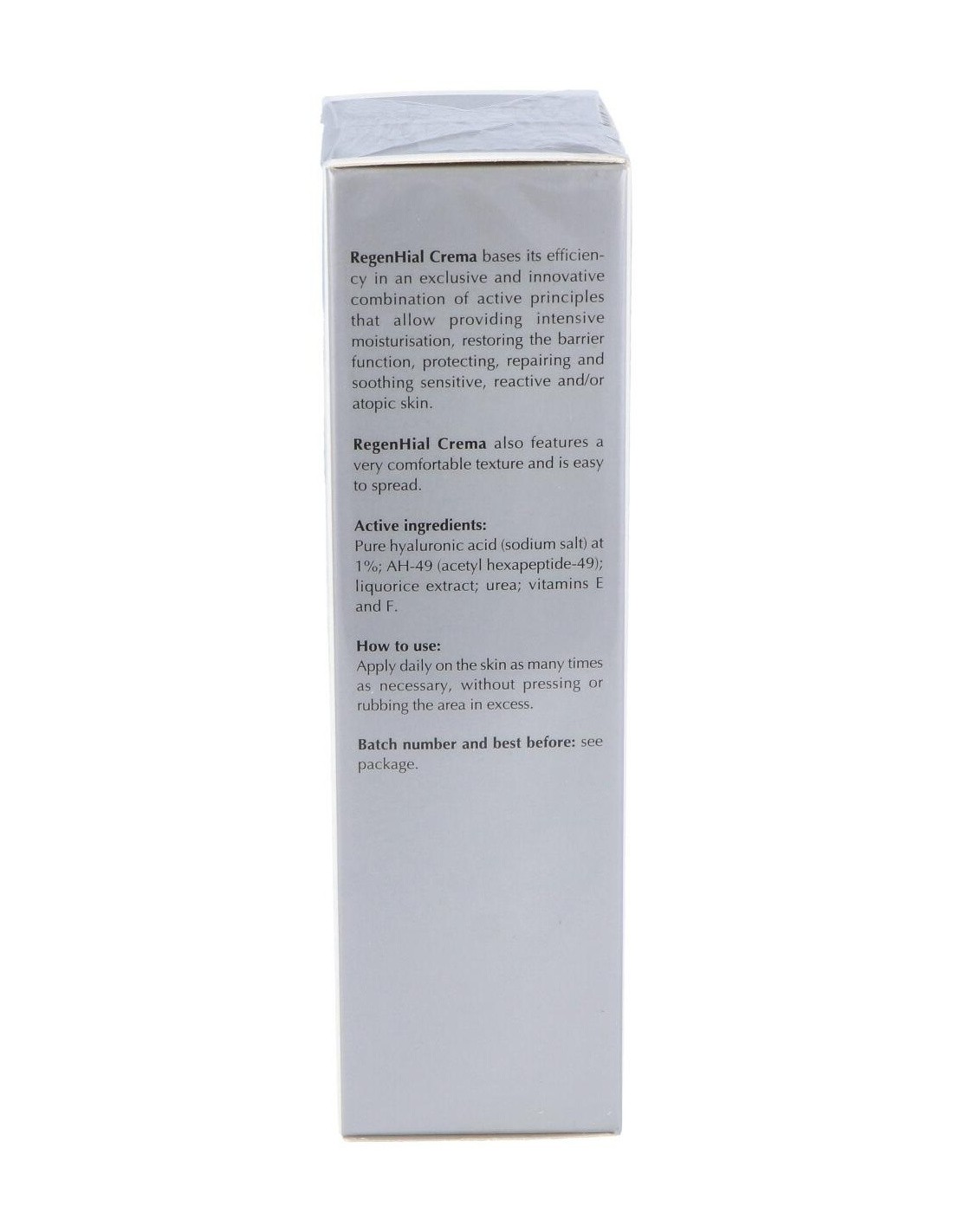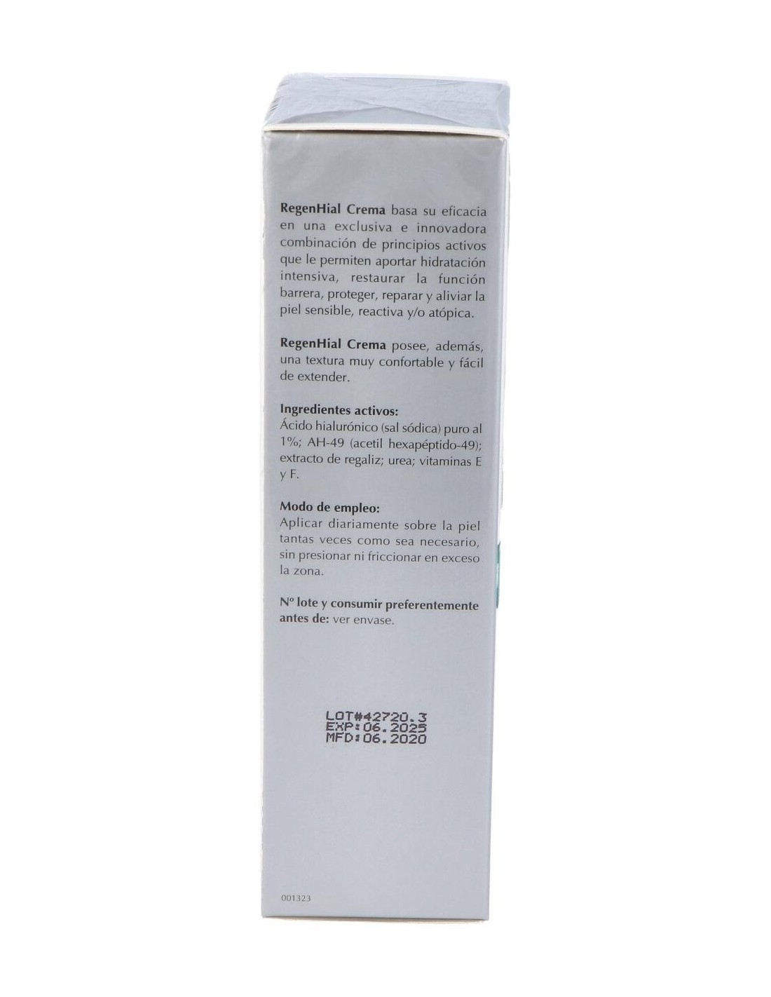 Crema de uso tópico altamente hidratante, regenerante, emoliente y calmante a base de ácido hialurónico puro (sal sódica) al 1%, AH-49 (acetil hexapéptido-49), extracto de regaliz, urea y vitaminas E y F. Restaura la función barrera, evita la pérdida de agua transepidérmica (TEWL), promueve la renovación celular, protege frente a las agresiones de los radicales libres y alérgenos, calma, suaviza y atenúa la inflamación neurogénica y el picor asociado a ella.