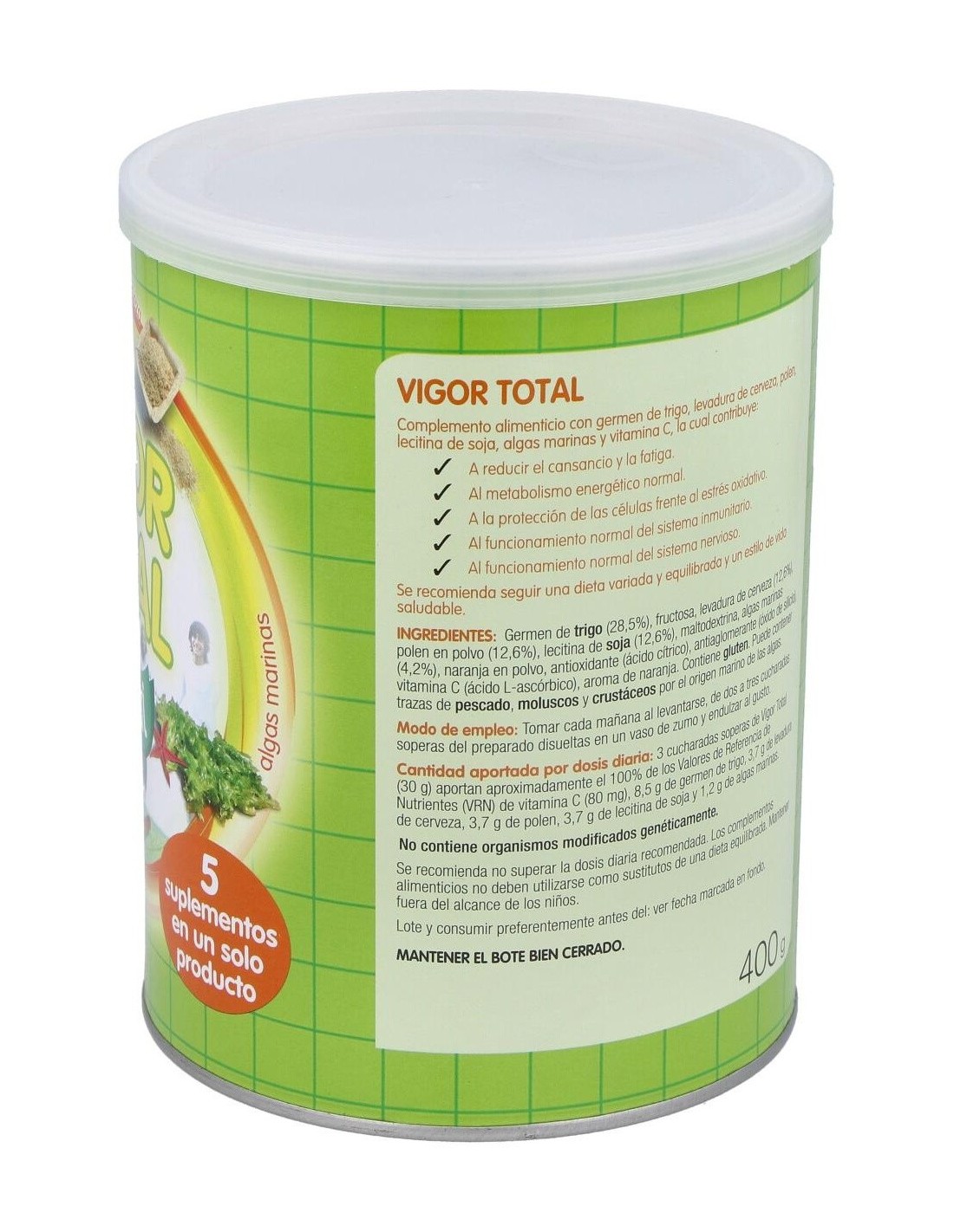Santiveri Vigor Total + 400g es un suplemento alimenticio a base de levadura de cerveza, polem, germen de trigo, maca, lectina de soja, vitamina C y algas kelp. Ayuda a energizar el cuerpo.