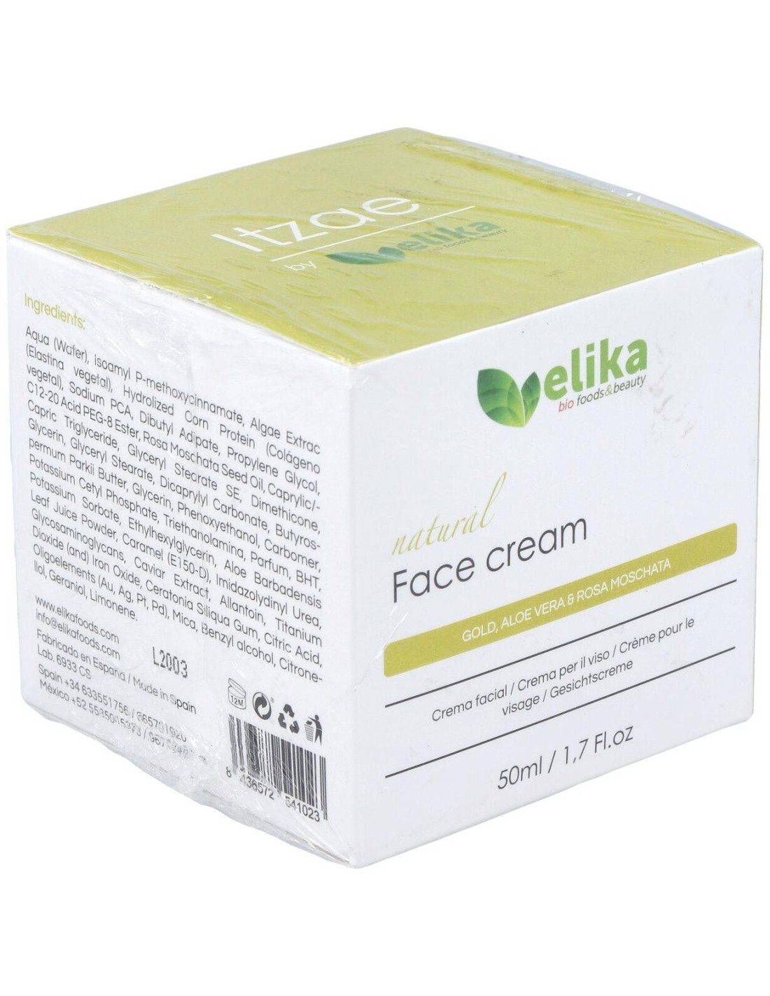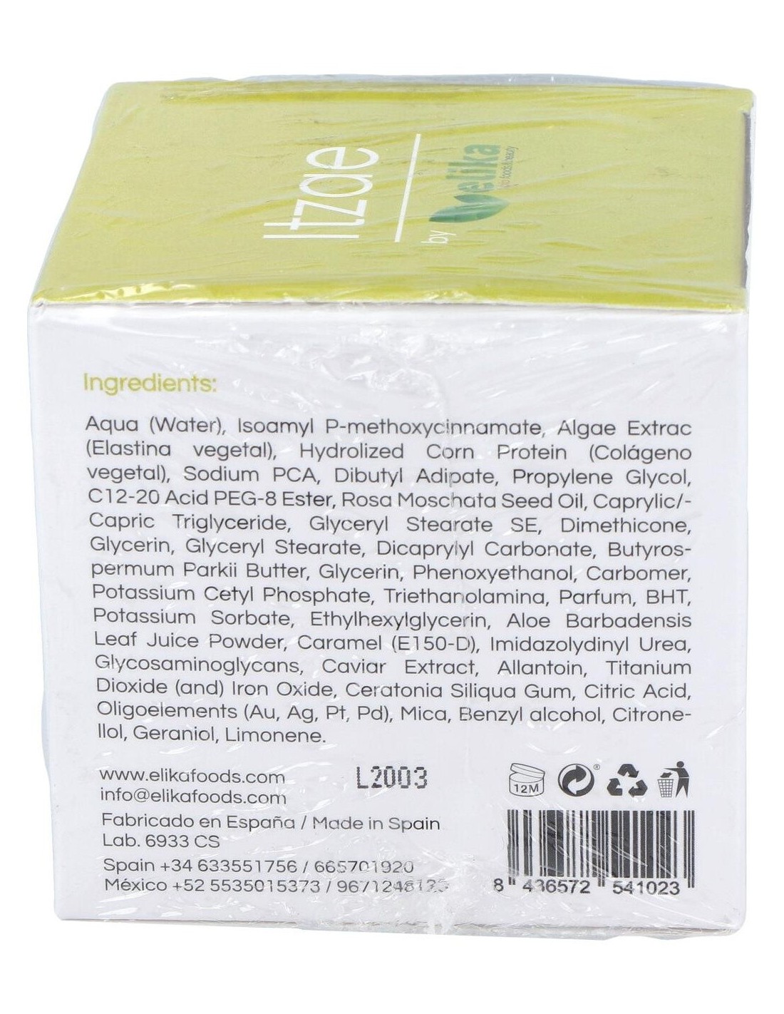 Agua, Isoamyl P-methoxycinnamate, Elastina vegetal, Colágeno vegetal, Sodium PCA, Dibutyl Adipate, Propylene Glycol, C12-20 Acid PEG-8 Ester, Aceite Rosa Mosqueta, Triglicerido Caprilico/Caprico, Gliceril Estearato SE, Dimeticona, Glicerina, Gliceril Estearato, Dicaprylyl Carbonate, Manteca Karité, Glicerina, Phenoxyethanol, Carbomero, Potassium Cetyl Phosphate, Triethanolamina, BHT, Sorbato Potásico, Ethylhexylglycerin, Extracto polvo Aloe Vera, Caramelo, Imidazolydinyl Urea, Glycosaminoglycans, Extracto de Caviar, Alantoina, Óxido de Titanio, Ceratonia Siliqua Gum, Ácido Cítrico, Oligoelementos (Au, Ag, Pt, Pd), Mica (Mina de Oro), Benzyl alcohol, Citronellol, Geraniol, Limonene.